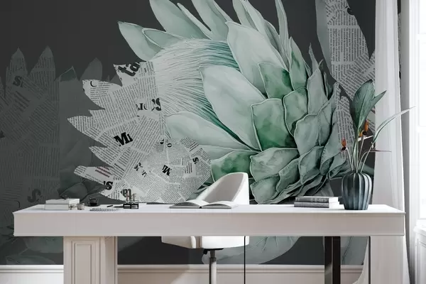 Fototapeedid Protea lilled, ajalehe kunst, lilleline, troopiline, tume taust, rohelised värvid Nr w03667v3