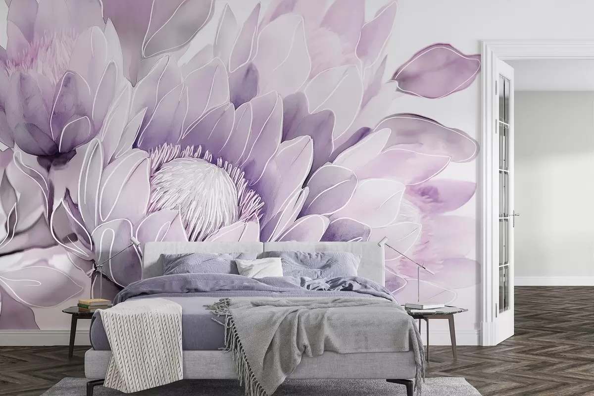 Fototapeedid Ilusad protea lilled, joonistus, troopiline, lillad värvid Nr w03669v1