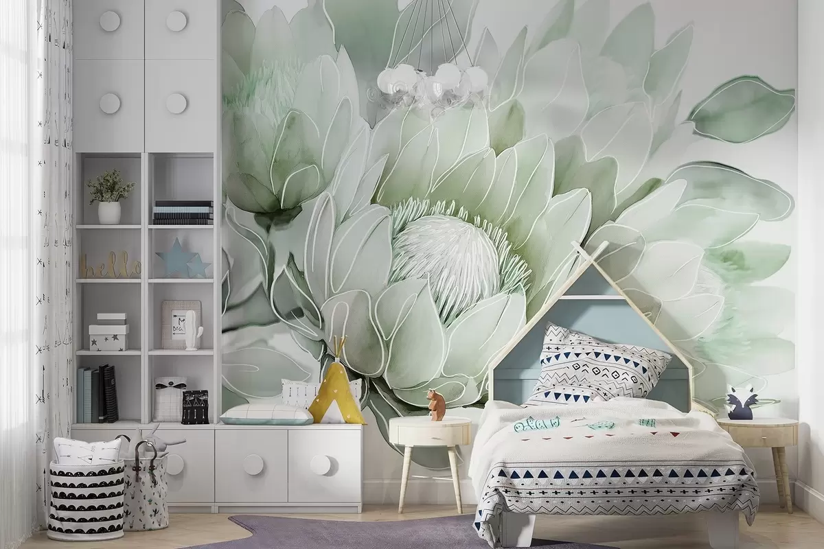 Fototapeedid Ilusad protea lilled, joonistus, troopiline, rohelised värvid Nr w03669v2