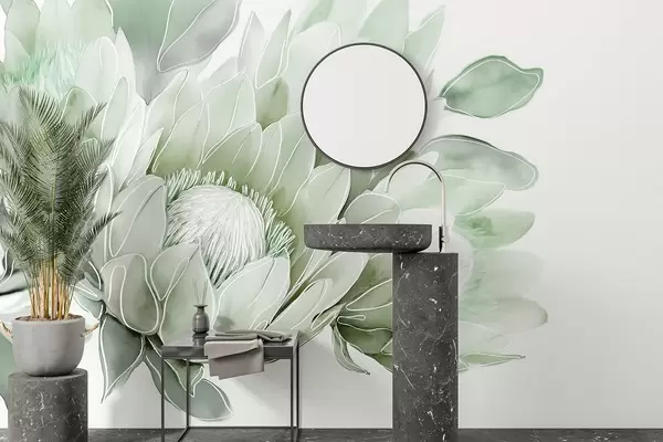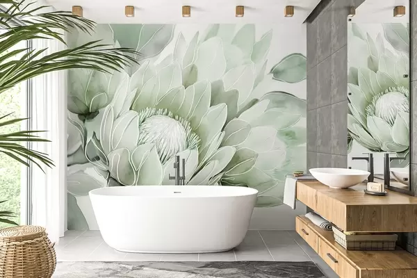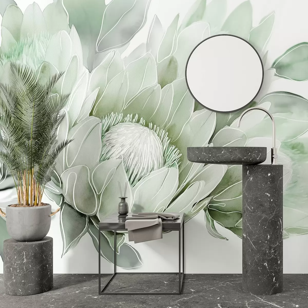 Fototapeedid Ilusad protea lilled, joonistus, troopiline, rohelised värvid Nr w03669v2