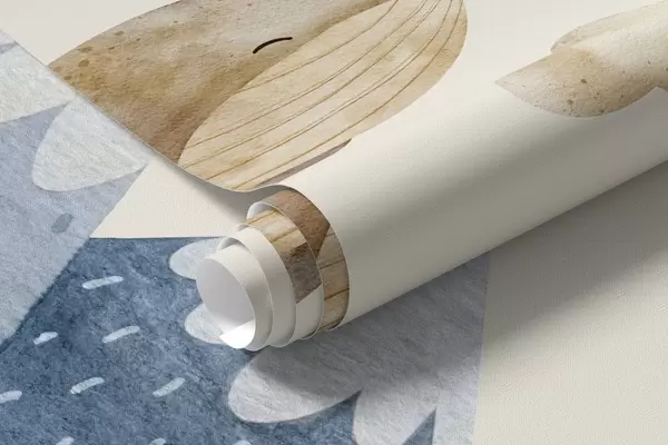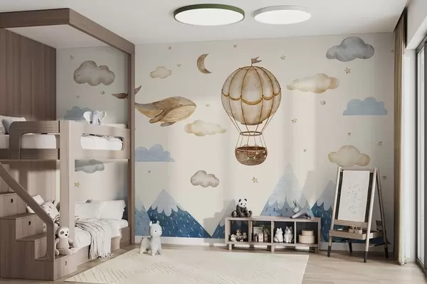 Fototapeedid Õhupall, armas vaal, tähistaevas, mäed, akvarell, sinine ja beež värvid Nr w03672