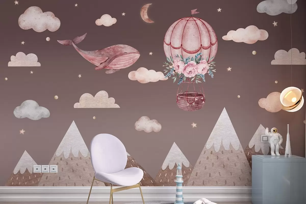 Fototapeedid Armas vaal koos õhupalliga, tume taevas koos pilvedega, mäed, akvarell, roosa värvid Nr w03673v1