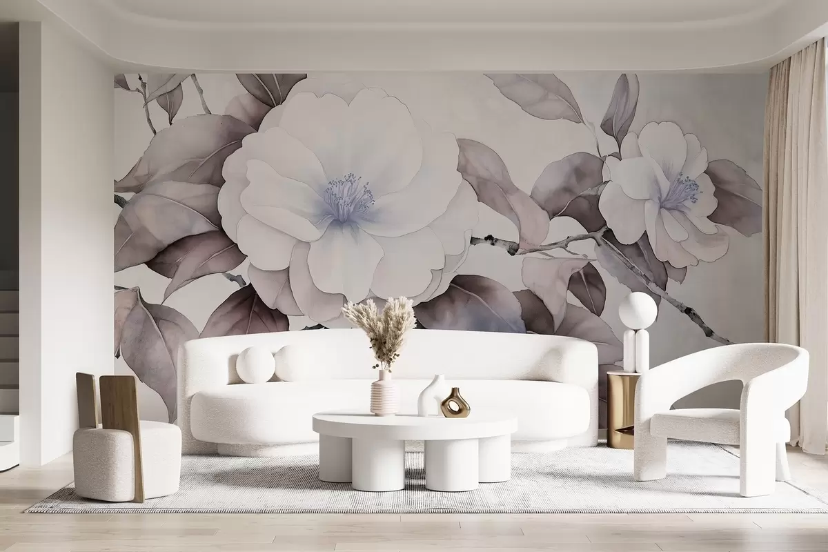 Fototapeedid Akvarellstiilis kameelia õied oksal, lillad värvid Nr w03761v1