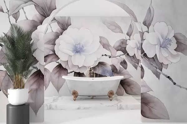 Fototapeedid Akvarellstiilis kameelia õied oksal, lillad värvid Nr w03761v1