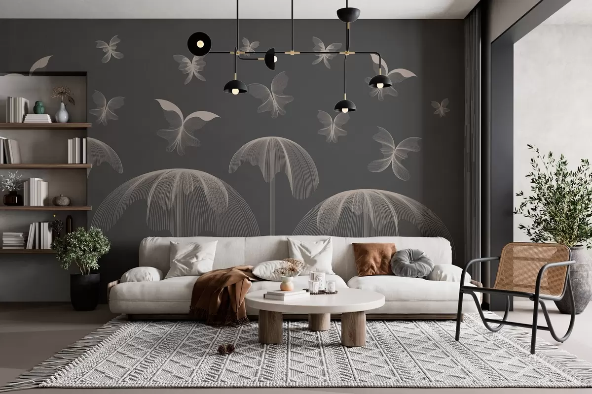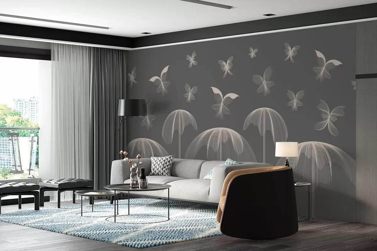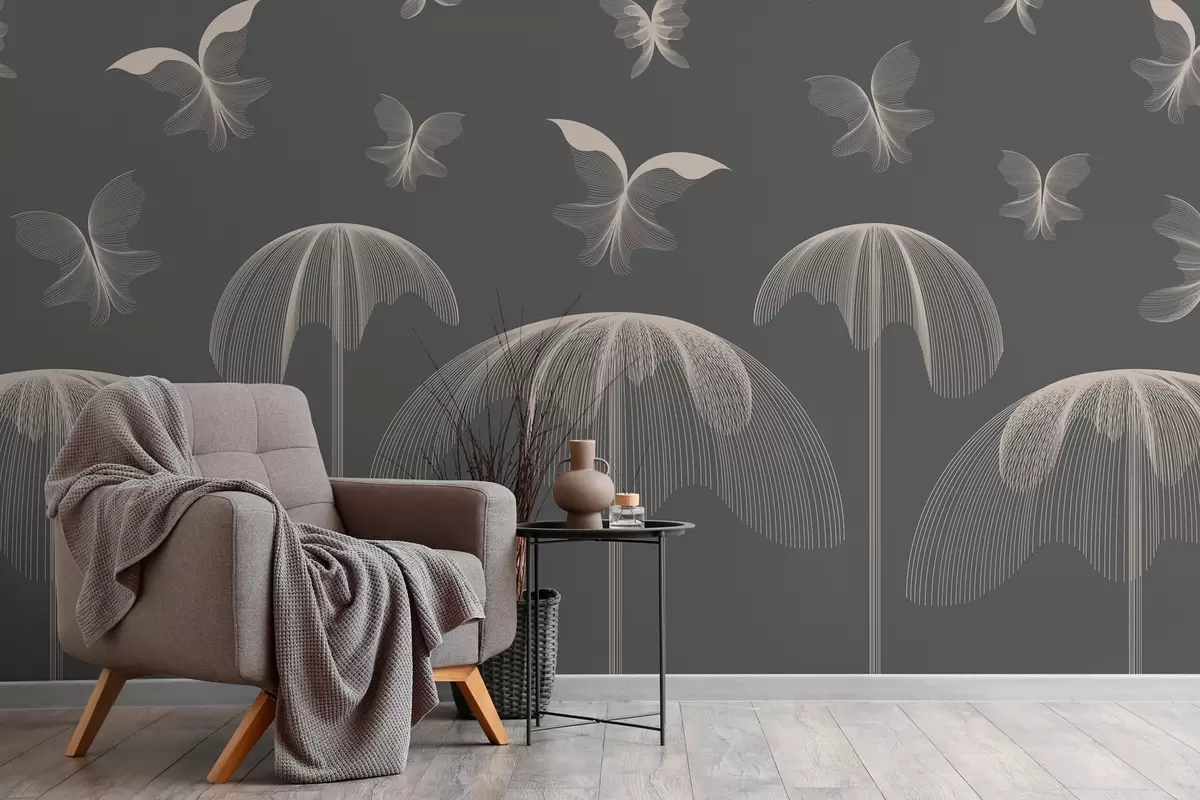 Fototapeedid minimalistlik lineaarne tapeet liblikad ja purskkaevud tumehallil taustal Nr w03762v1