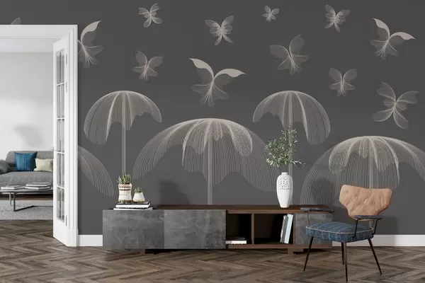 Fototapeedid minimalistlik lineaarne tapeet liblikad ja purskkaevud tumehallil taustal Nr w03762v1
