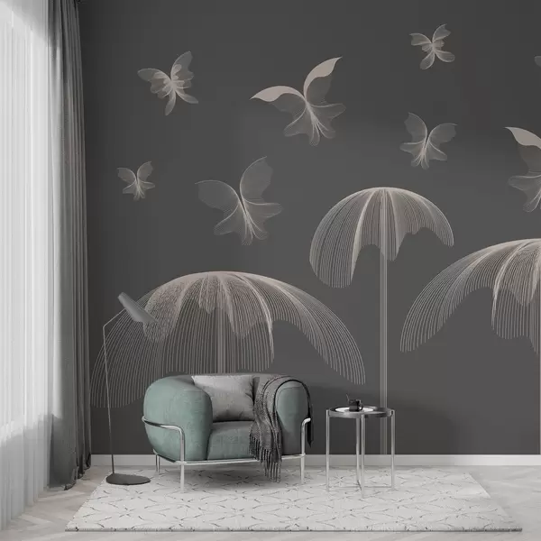 Fototapeedid minimalistlik lineaarne tapeet liblikad ja purskkaevud tumehallil taustal Nr w03762v1