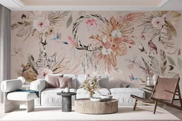 Fototapeedid Boho stiilis ornament pioonilillede ja lindudega, akvarellstiilis, pehmed värvid Nr w03885v3