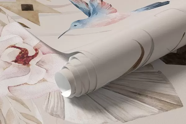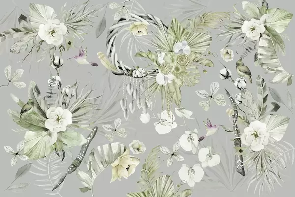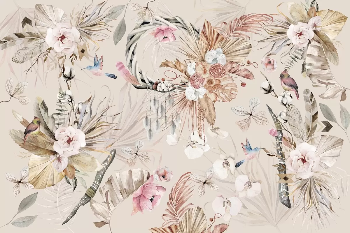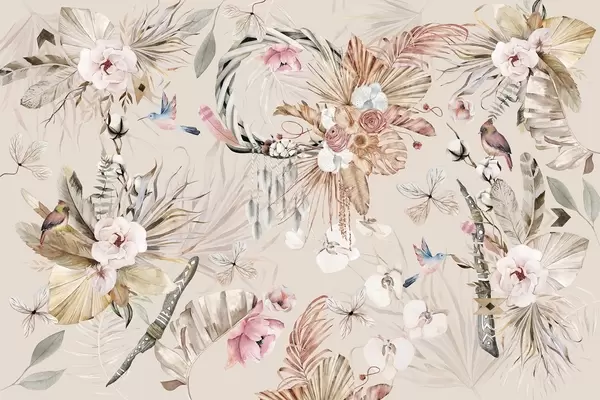 Fototapeedid Boho stiilis ornament pioonilillede ja lindudega, akvarellstiilis, pehmed värvid Nr w03885v3