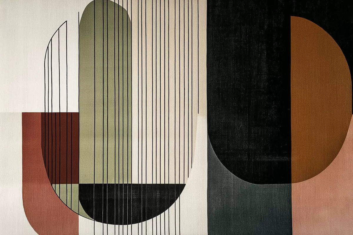 Fototapeedid kaasaegne abstraktne geomeetriline kompositsioon kattuvate kujundite ja vertikaalsete joonte mustritega, trapetsid ja ovaalid täitvad õhukesed jooned, pehme tekstiilitekstuuri pealekandmine, soojad summutatud toonid nagu oliivroheline, taupe, beež ja süsi, peened läbipaistvuse efektid kujundite vahel Nr w03937v4