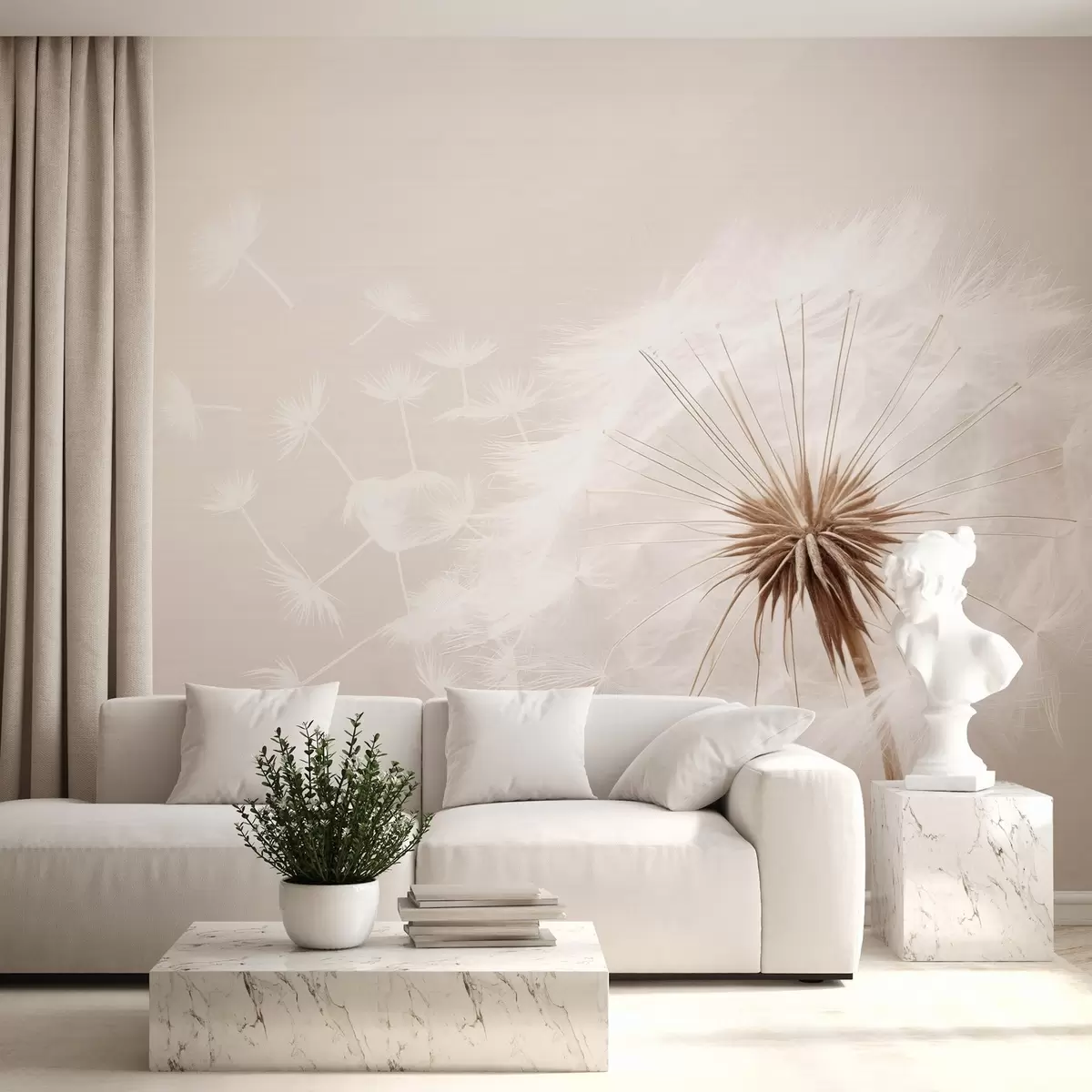 Fototapeedid Moodne pehme lillekompositsioon täisõielise võilillepeaga ja hõljuvate seemnetega, mis on asetatud õrna tekstiililaadse tekstuuri taustale Nr w03939