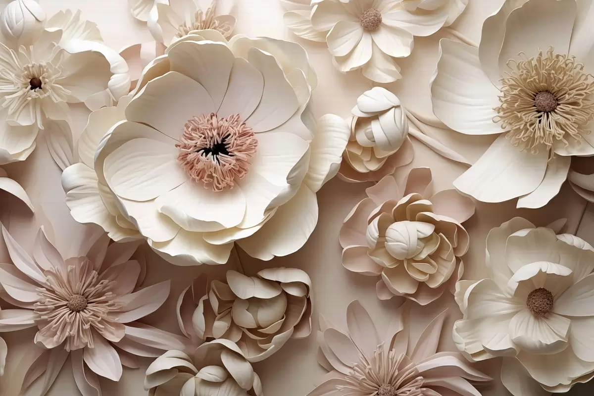 Fototapeedid Volüümne lillekompositsioon õrnade paberilaadsete või tekstiilist inspireeritud kroonlehtedega elevandiluu, vanilje ja punakas toonides, mis on asetatud soojale beežile lõuendile. Nr w03945