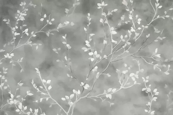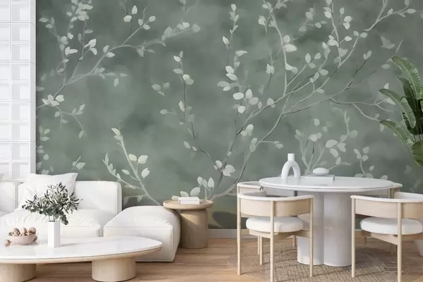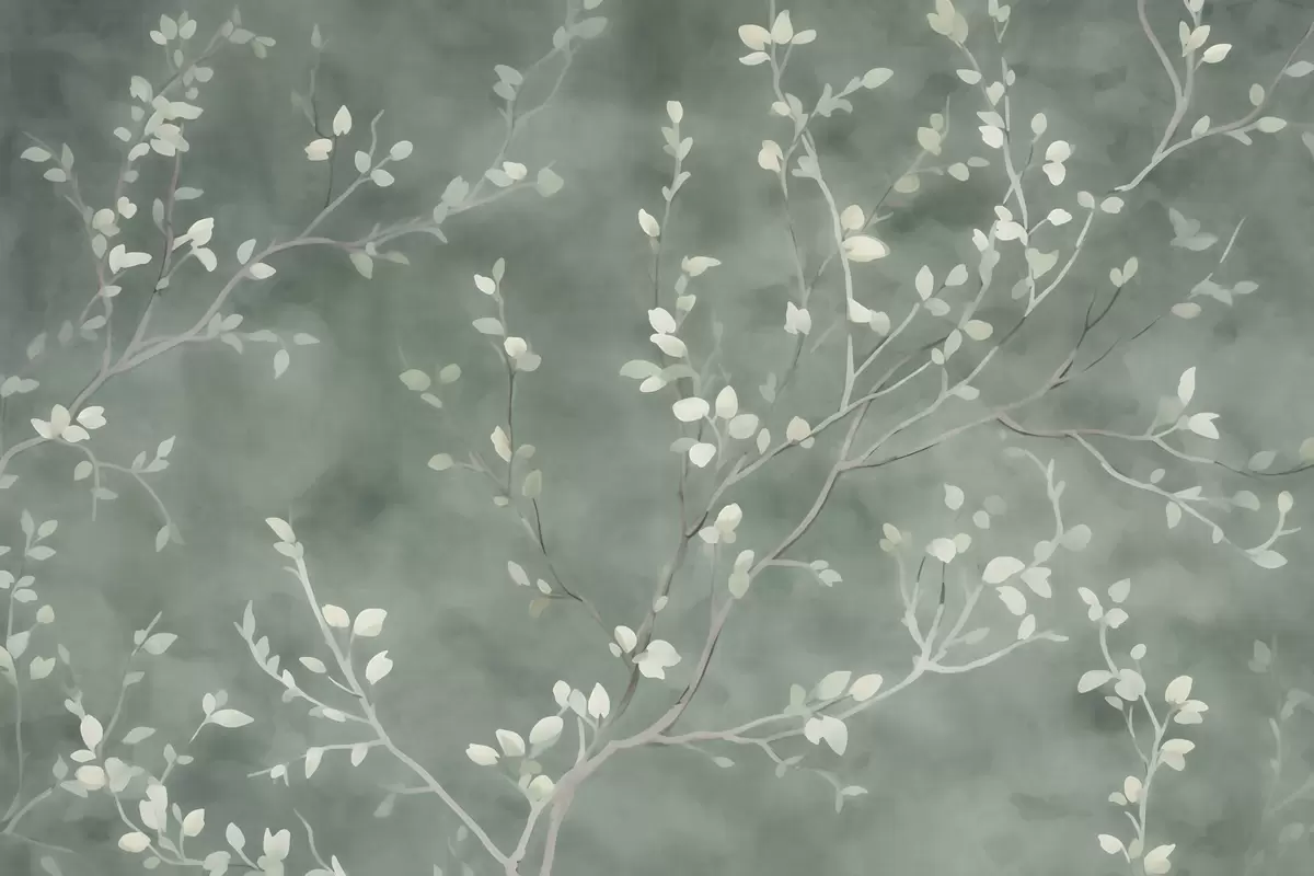 Fototapeedid minimalistlik käsitsi maalitud tapeet, millel on pehmed valged puuoksad koos õrnade lehtedega, mis hargnevad orgaaniliselt üle vaikselt salveirohelise tausta, peen botaaniline joonistus loomulikus voolus Nr w03949