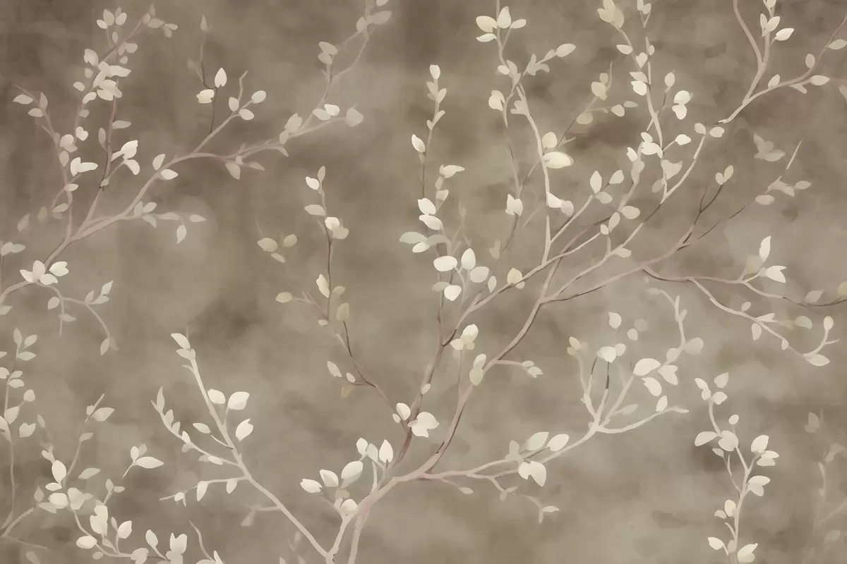 Fototapeedid minimalistlik käsitsi maalitud tapeet, millel on pehmed valged puuoksad koos õrnade lehtedega, mis hargnevad orgaaniliselt üle vaikselt salveirohelise tausta, peen botaaniline joonistus loomulikus voolus Nr w03949v1