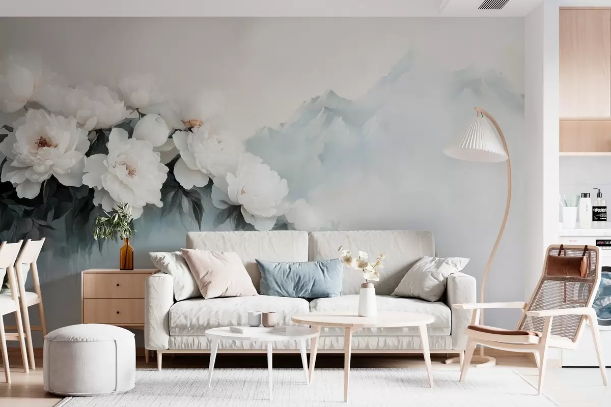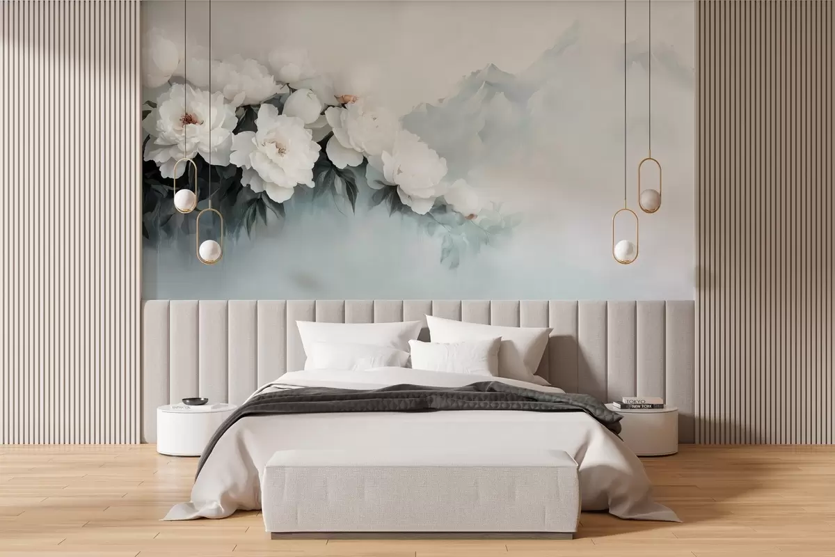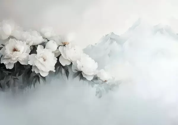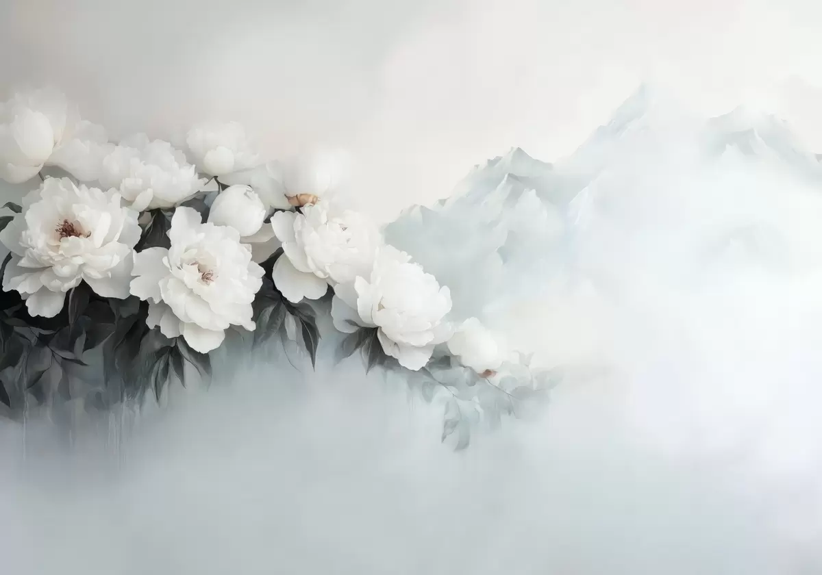 Fototapeedid maalilised lopsakad valged pojengid uduste mägede taustal Nr w03965