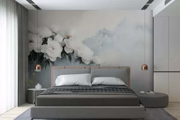 Fototapeedid maalilised lopsakad valged pojengid uduste mägede taustal Nr w03965