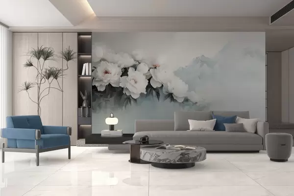 Fototapeedid maalilised lopsakad valged pojengid uduste mägede taustal Nr w03965
