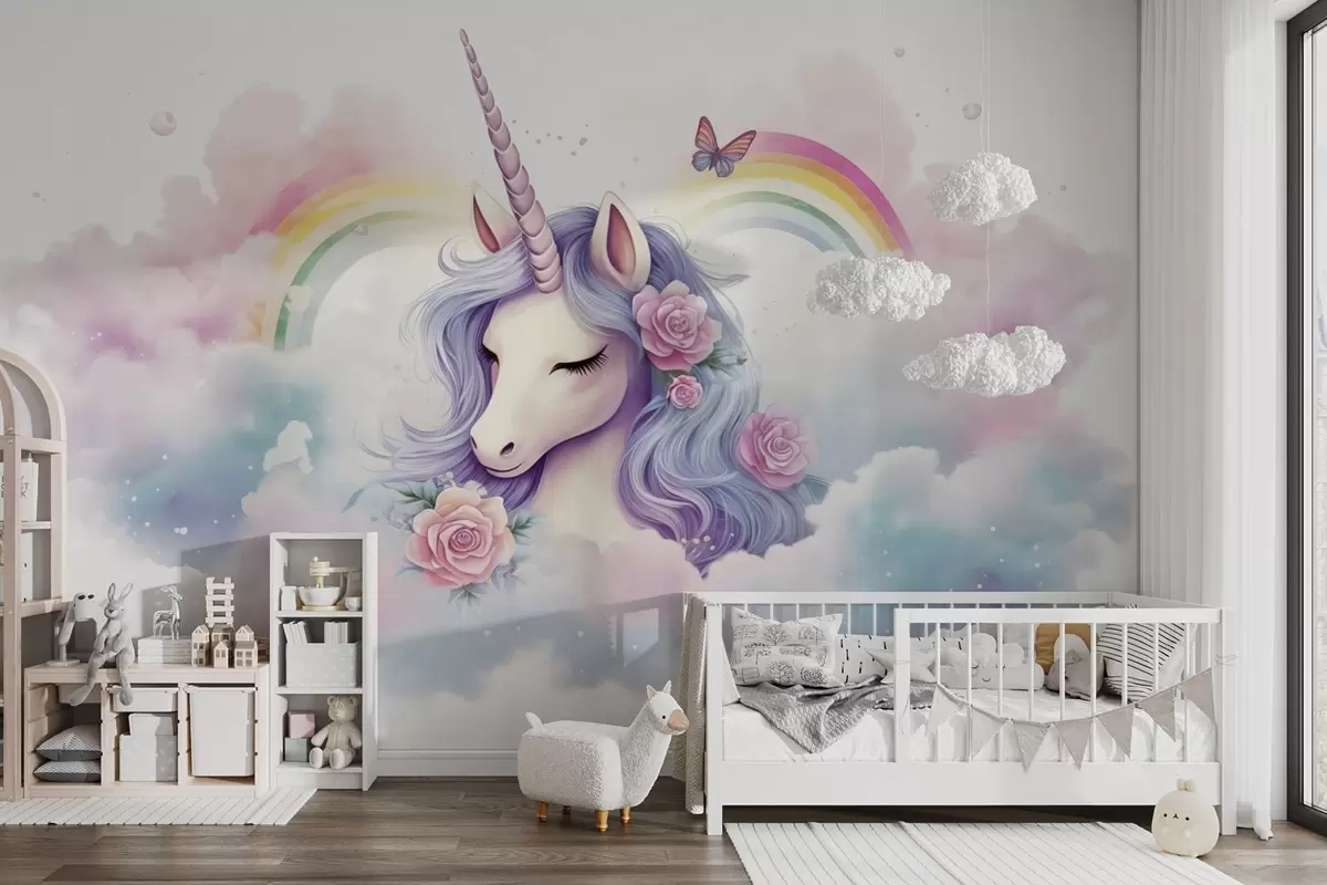 Fototapeedid Pastellne ükssarvik pilvedes koos vikerkaarega ja roosidega Nr w03990