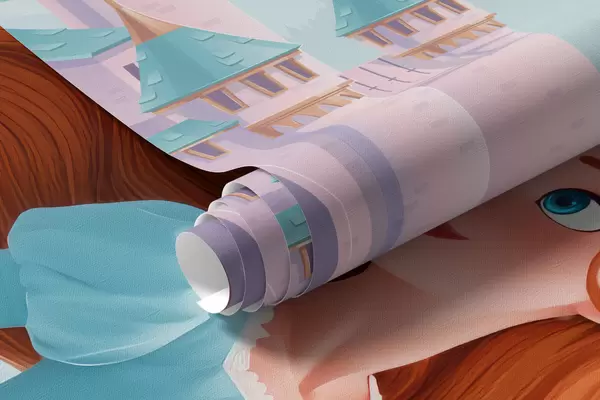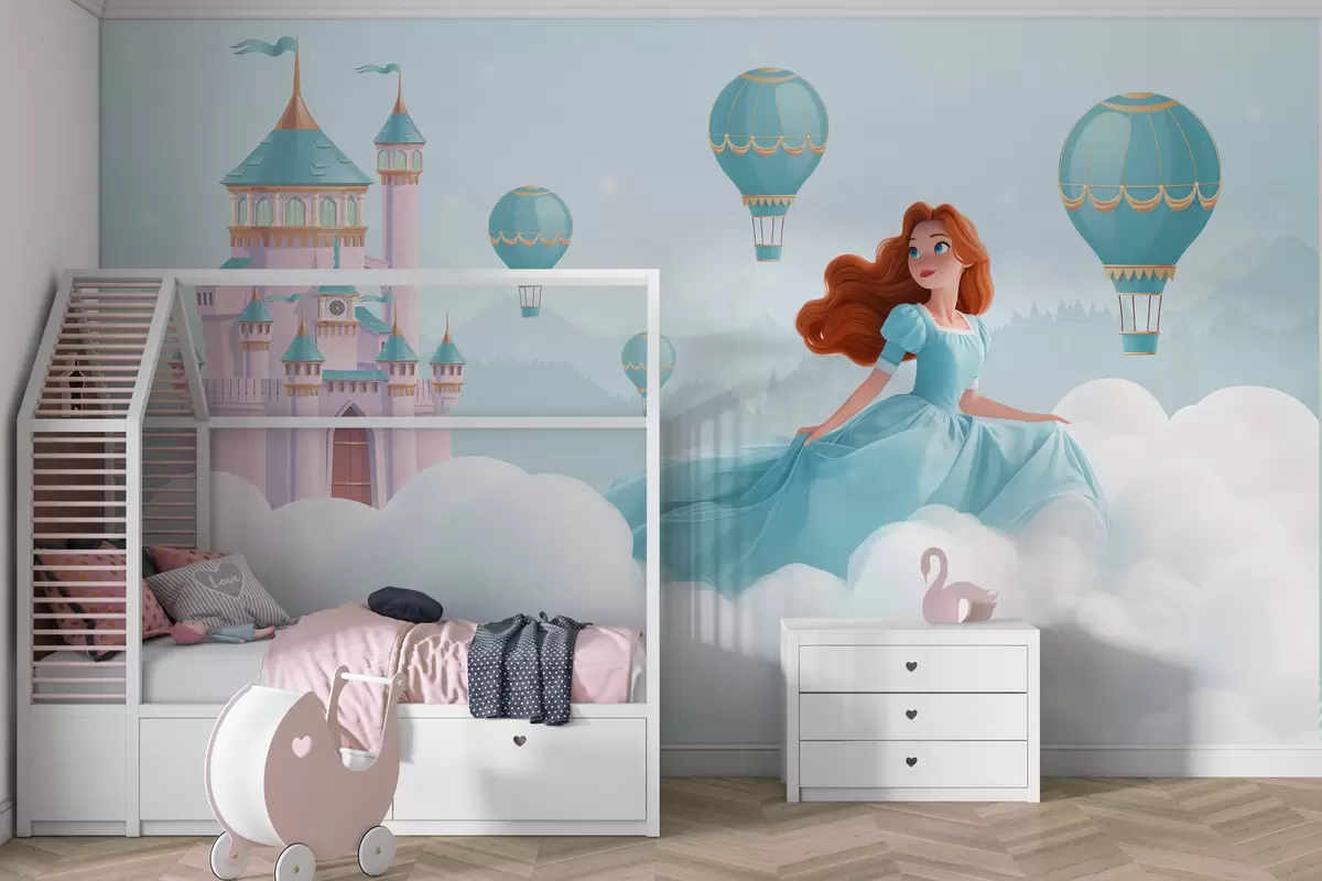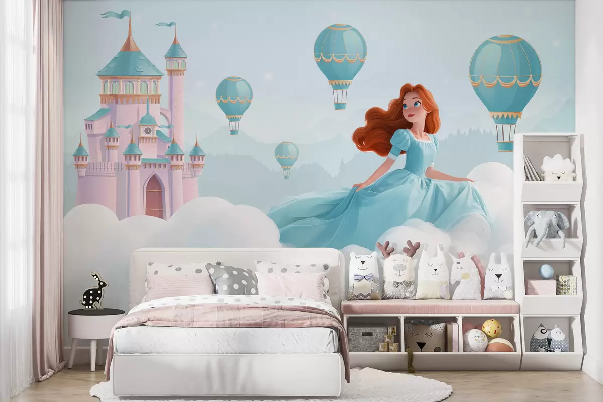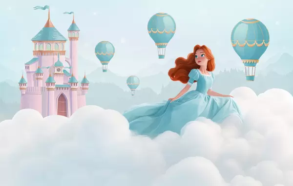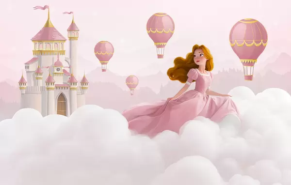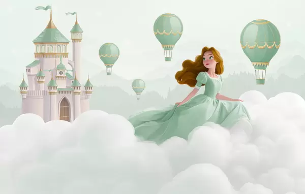 Fototapeedid Printsess pilvede keskel maastiku taustal koos lossiga Nr w04015
