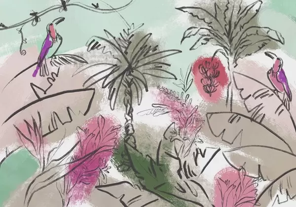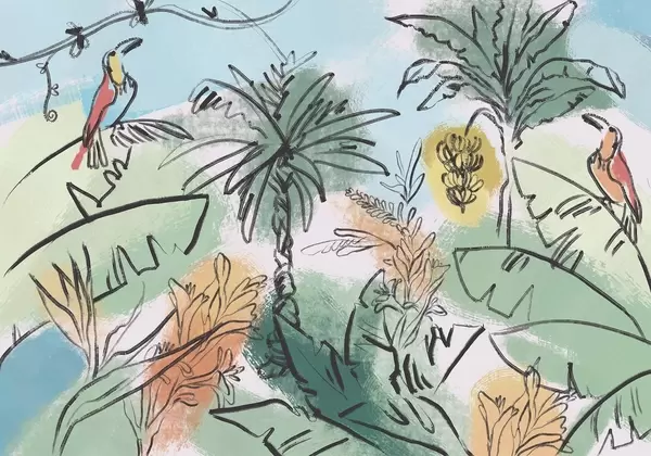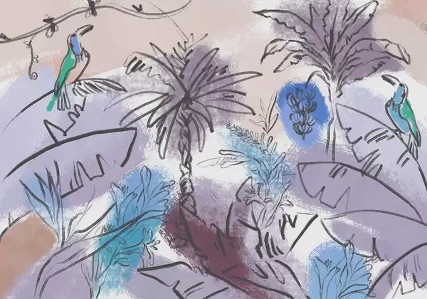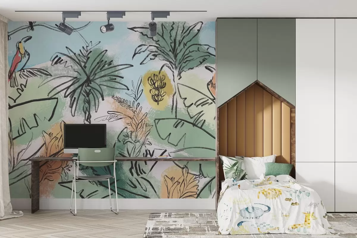 Fototapeedid Troopiline trükis papagoidega, rikkalikud värvid, troopika Nr w04019