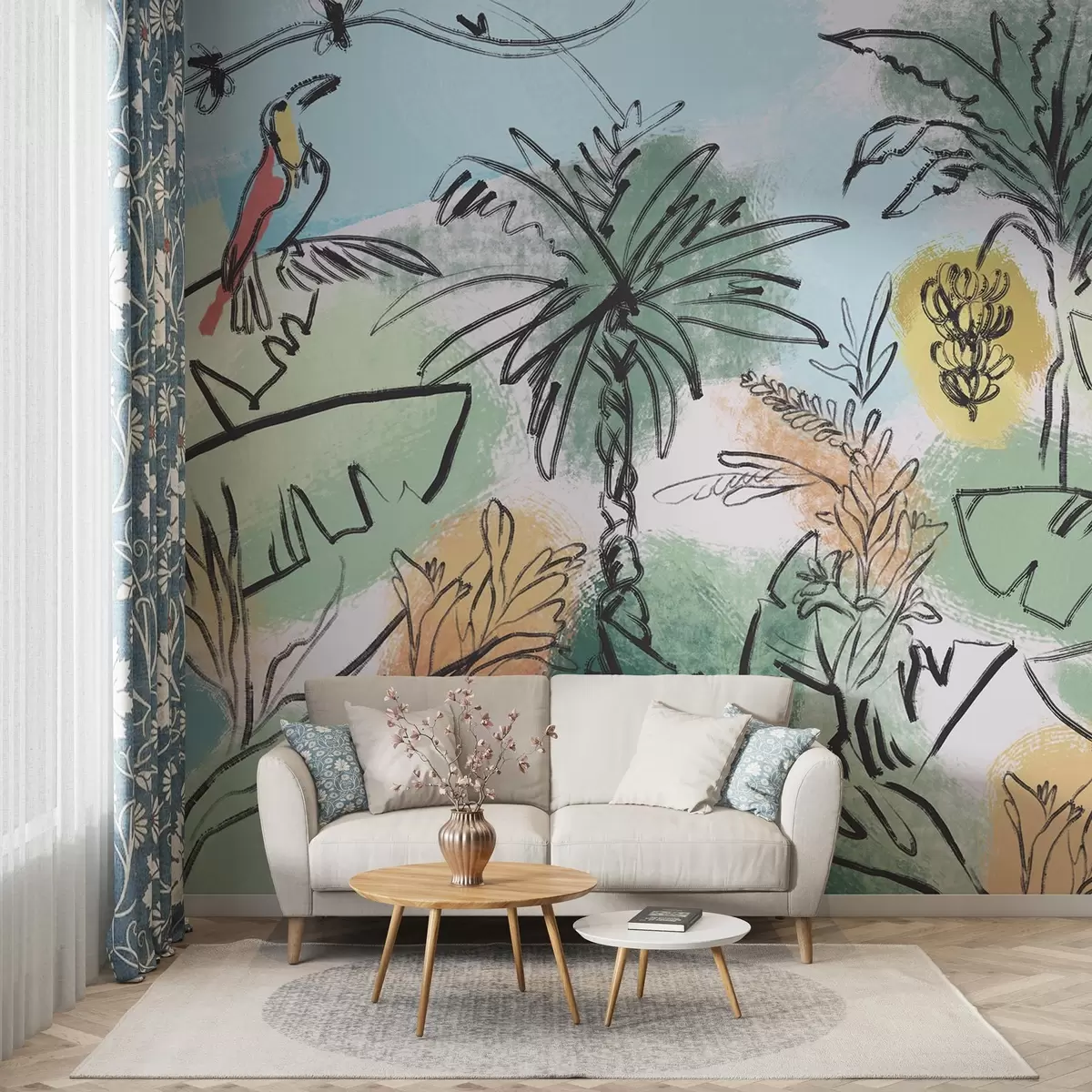 Fototapeedid Troopiline trükis papagoidega, rikkalikud värvid, troopika Nr w04019