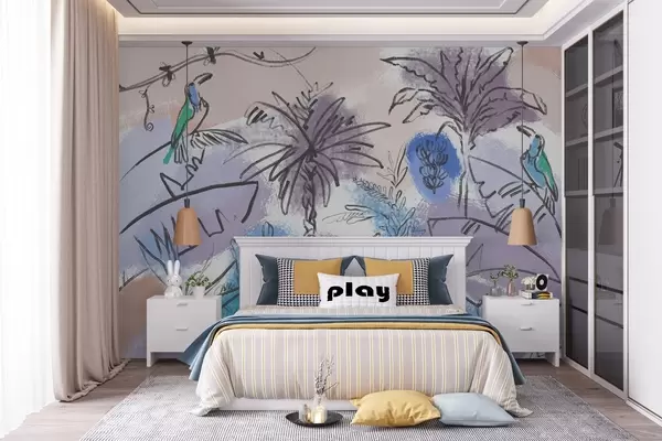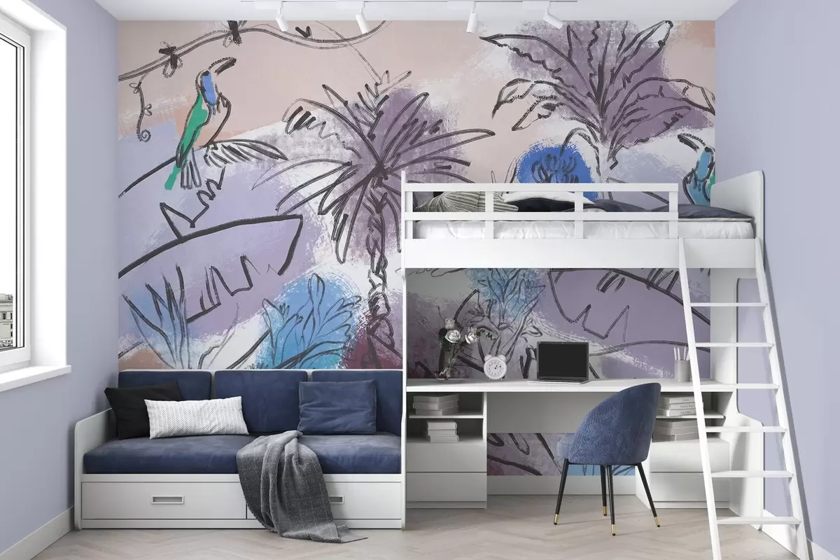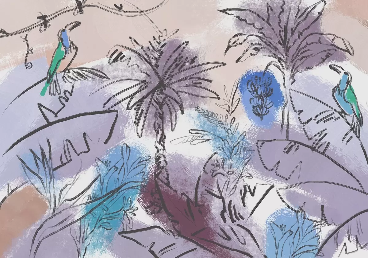 Fototapeedid Troopiline trükis siniste lilledega, maalilised papagoid Nr w04019v2