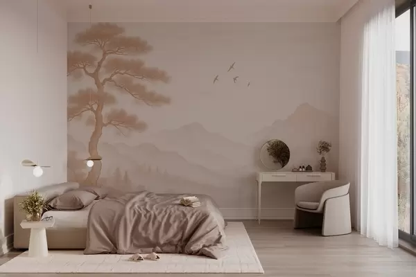 Fototapeedid panoraam mägedest koos suure moka toonides puuga Nr w04033v1