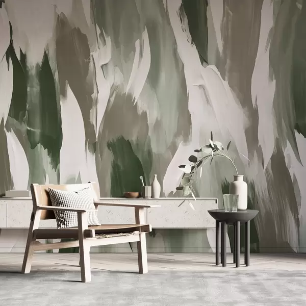 Fototapeedid Abstraktne pintslitõmbekompositsioon maalähedastes rohelistes, taupides ja elevandiluuvärvides, mis tekitab maandatud, loodusest inspireeritud rütmi Nr w04035v1