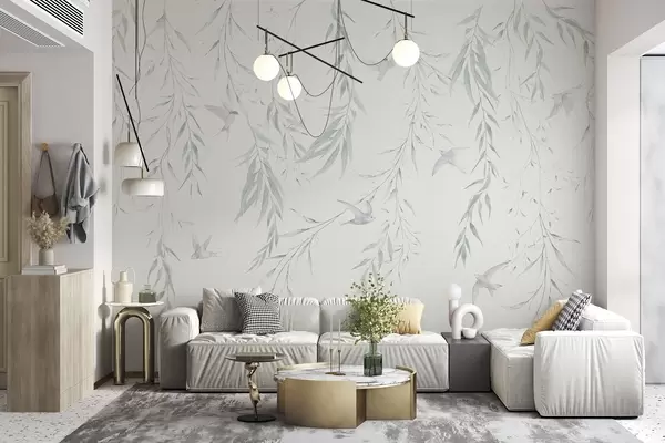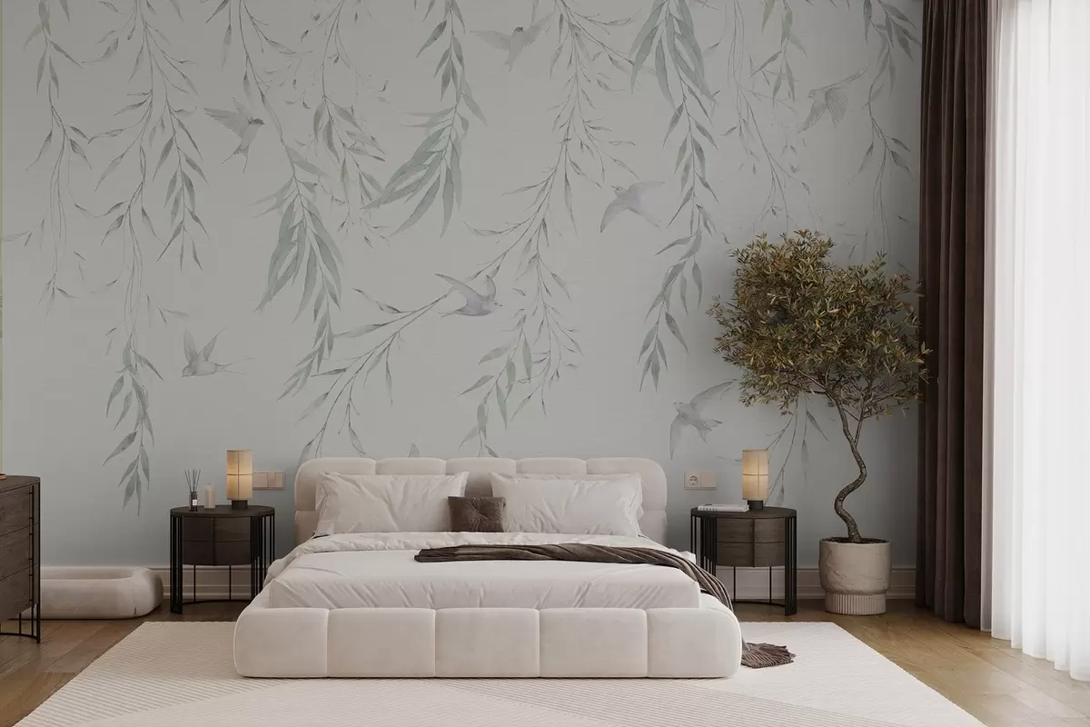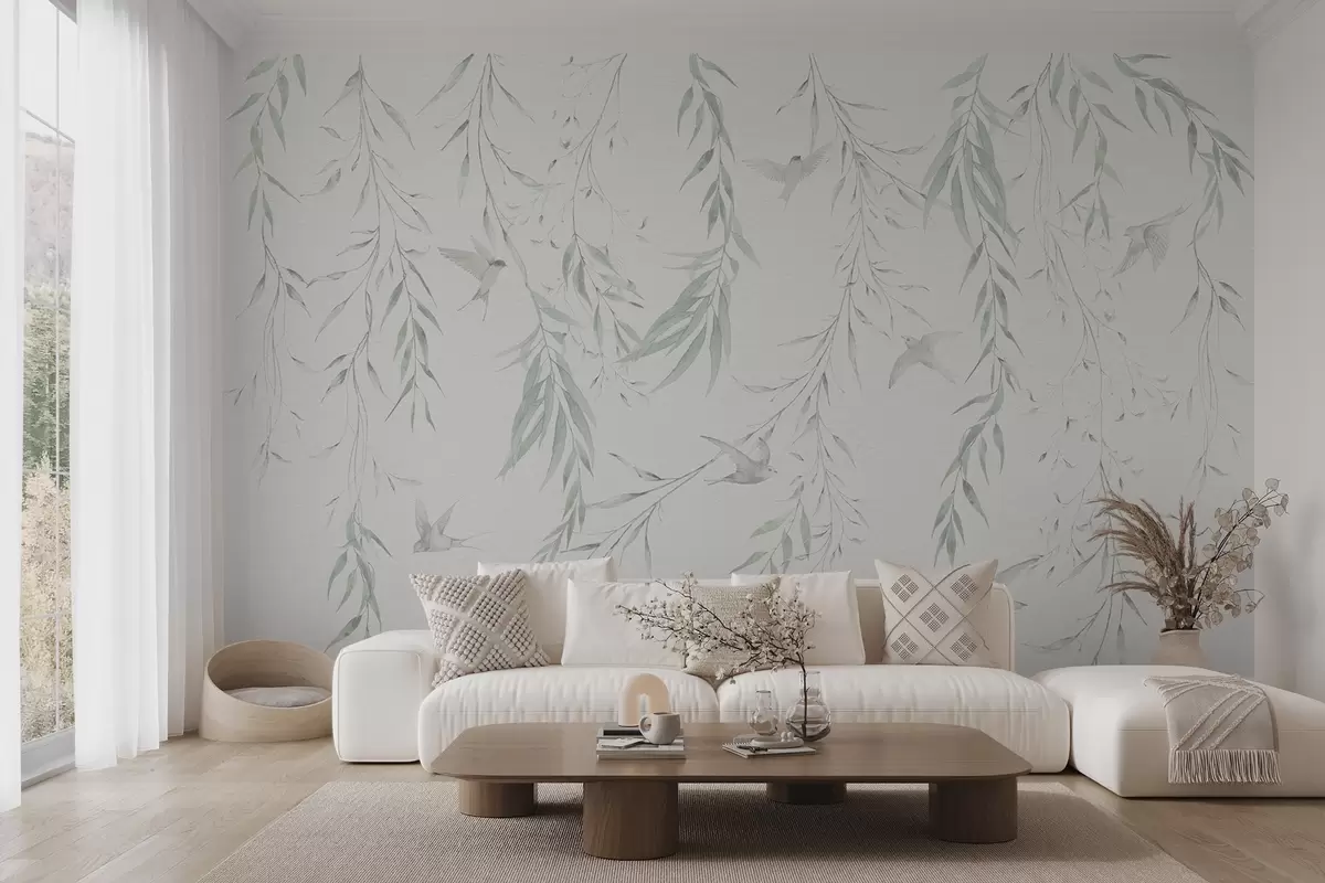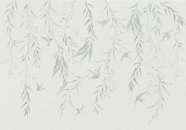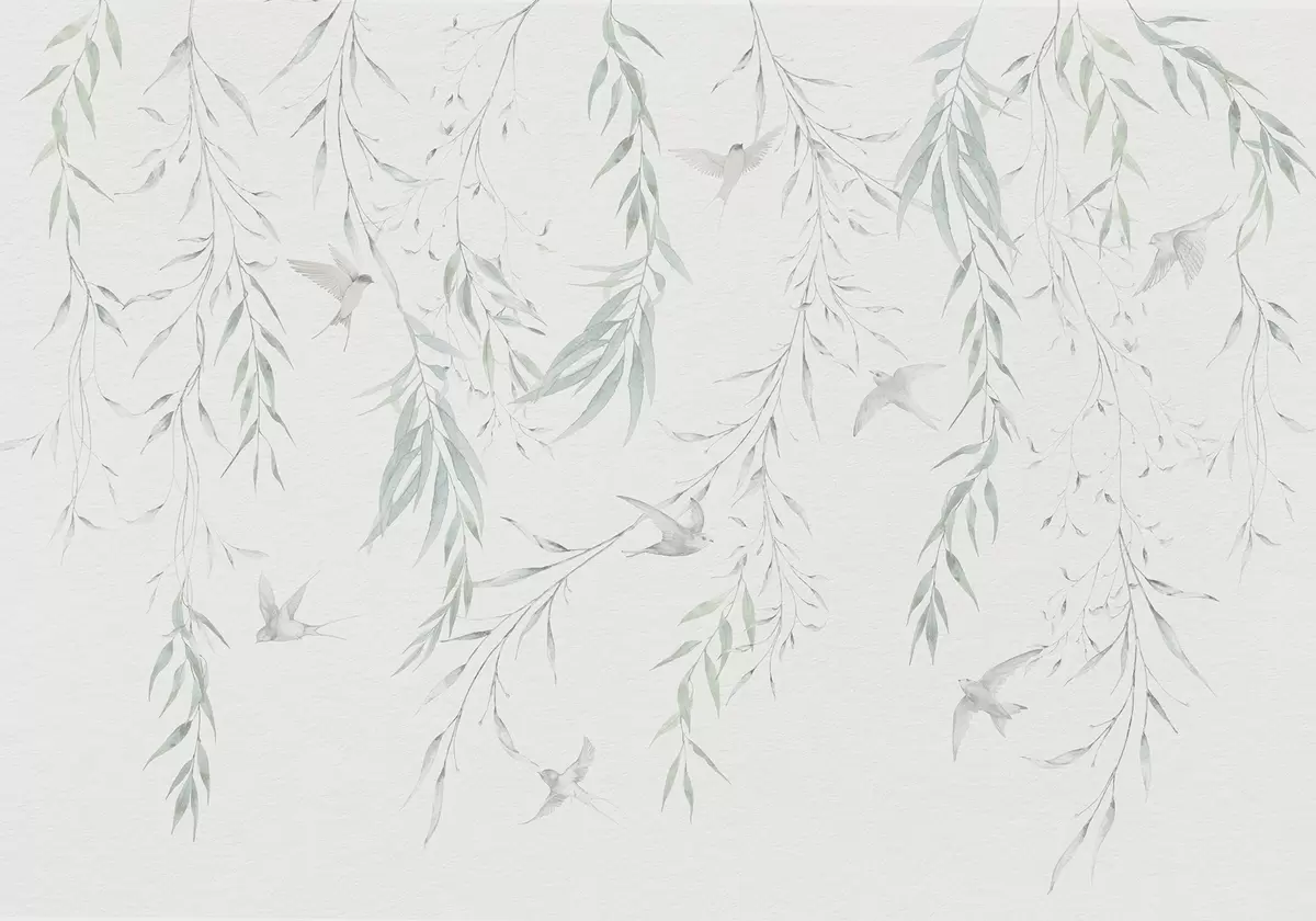Fototapeedid Roheliste lehtedega oksad rippuvad ja linnud Nr w04052