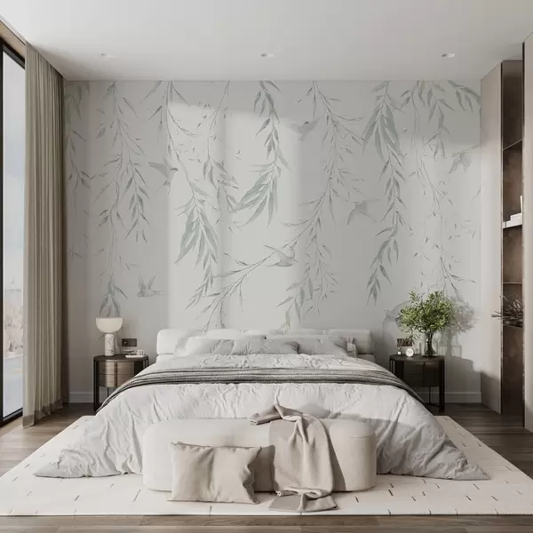 Fototapeedid Roheliste lehtedega oksad rippuvad ja linnud Nr w04052