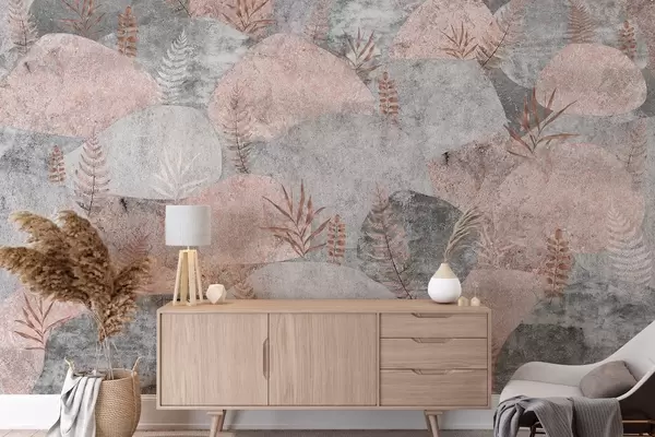 Fototapeedid Taimedega kivid, sõnajalad, põhjamaine, rustikaalne stiil, hallid ja roosad värvid Nr w04064v1