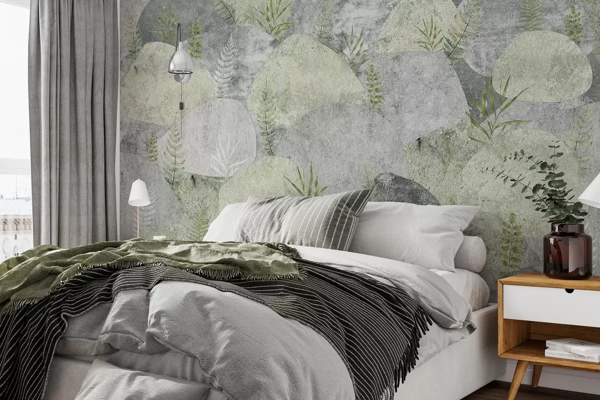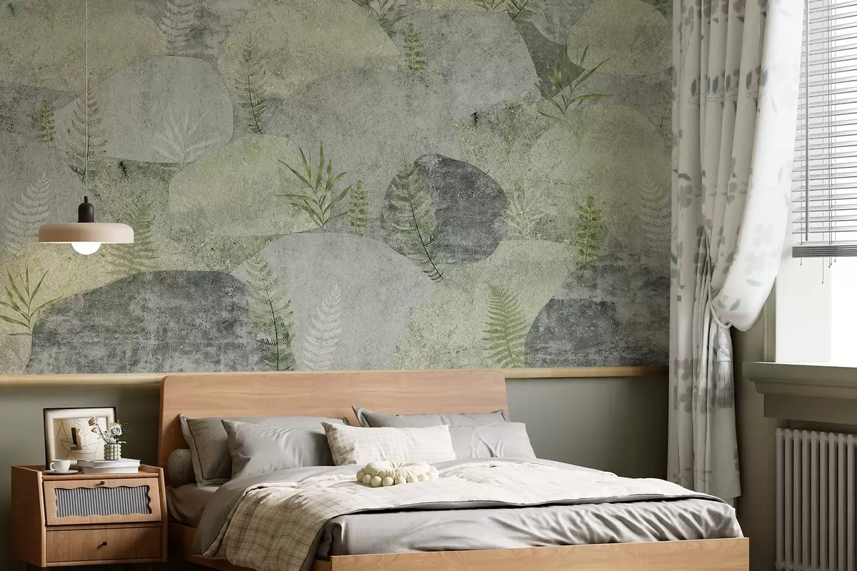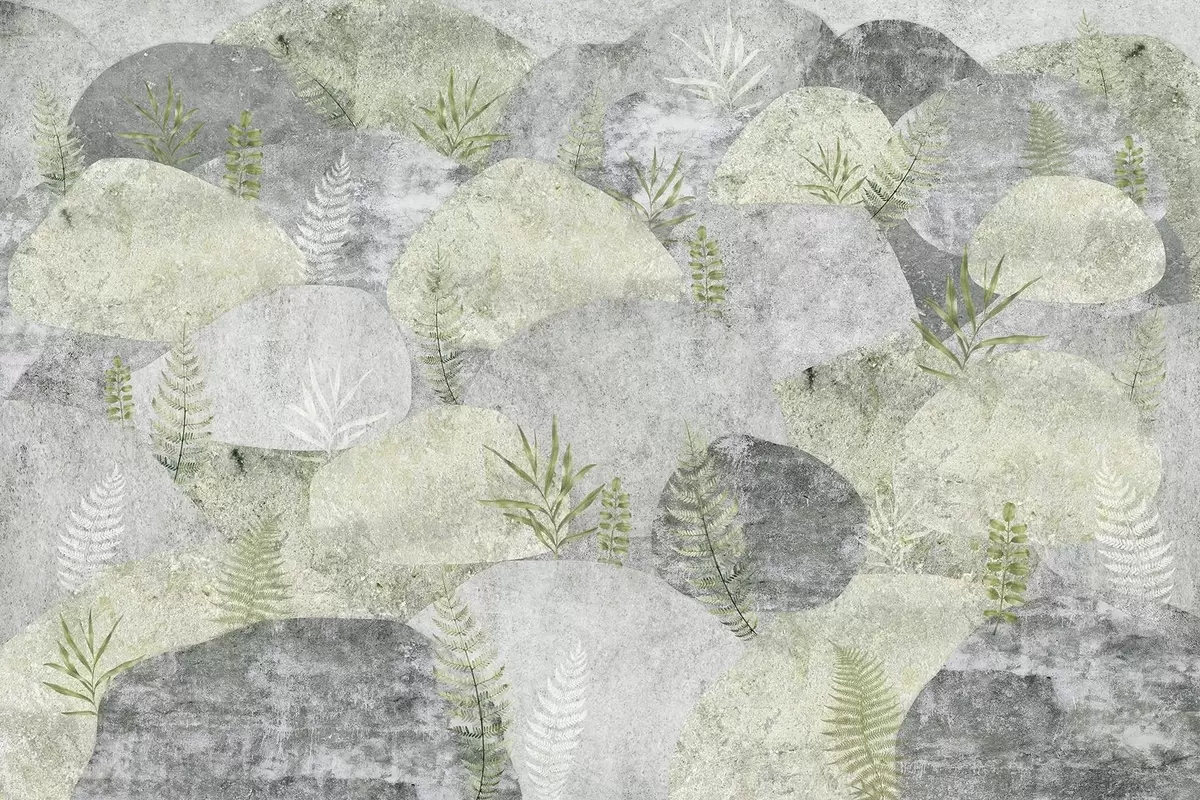 Fototapeedid Taimedega kivid, sõnajalad, põhjamaine, maalähedane stiil, hallid ja rohelised värvid Nr w04064v2