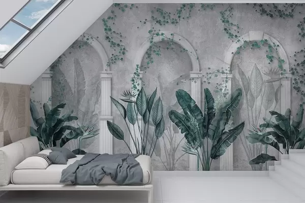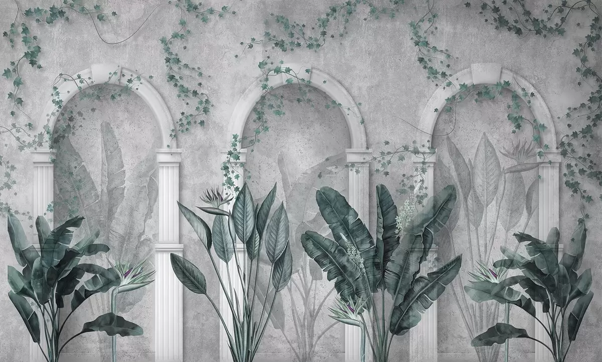 Fototapeedid Betoonist sein koos kaarega ja troopiliste taimedega, lillelised, sinised värvid Nr w04065v2