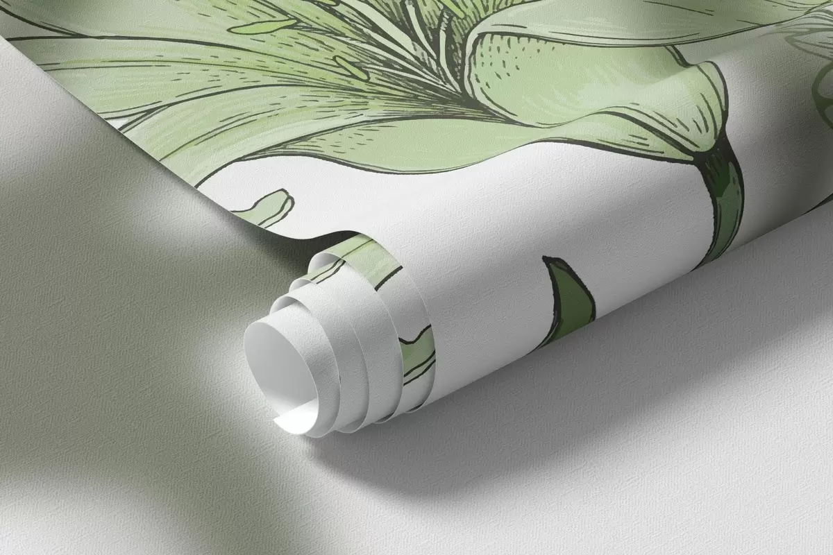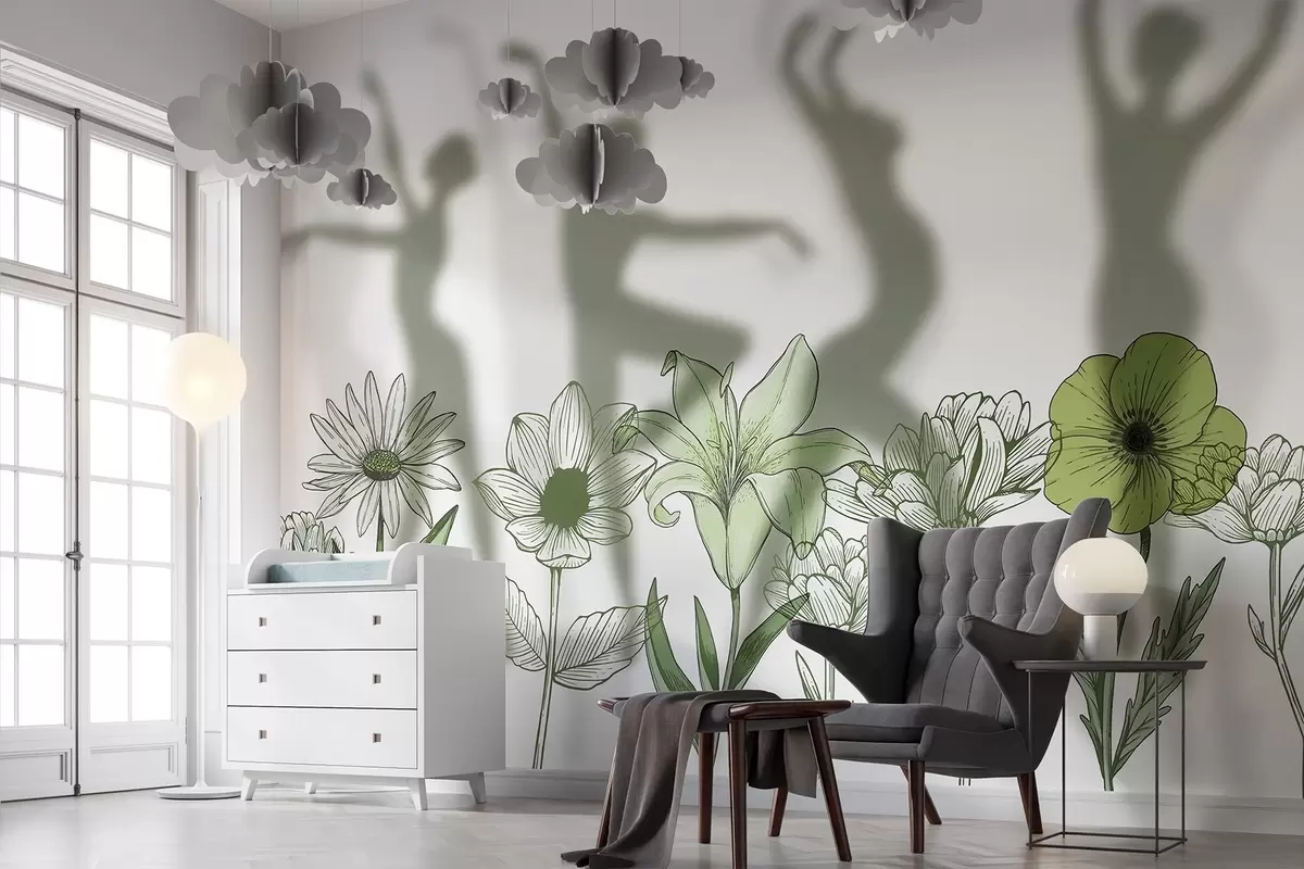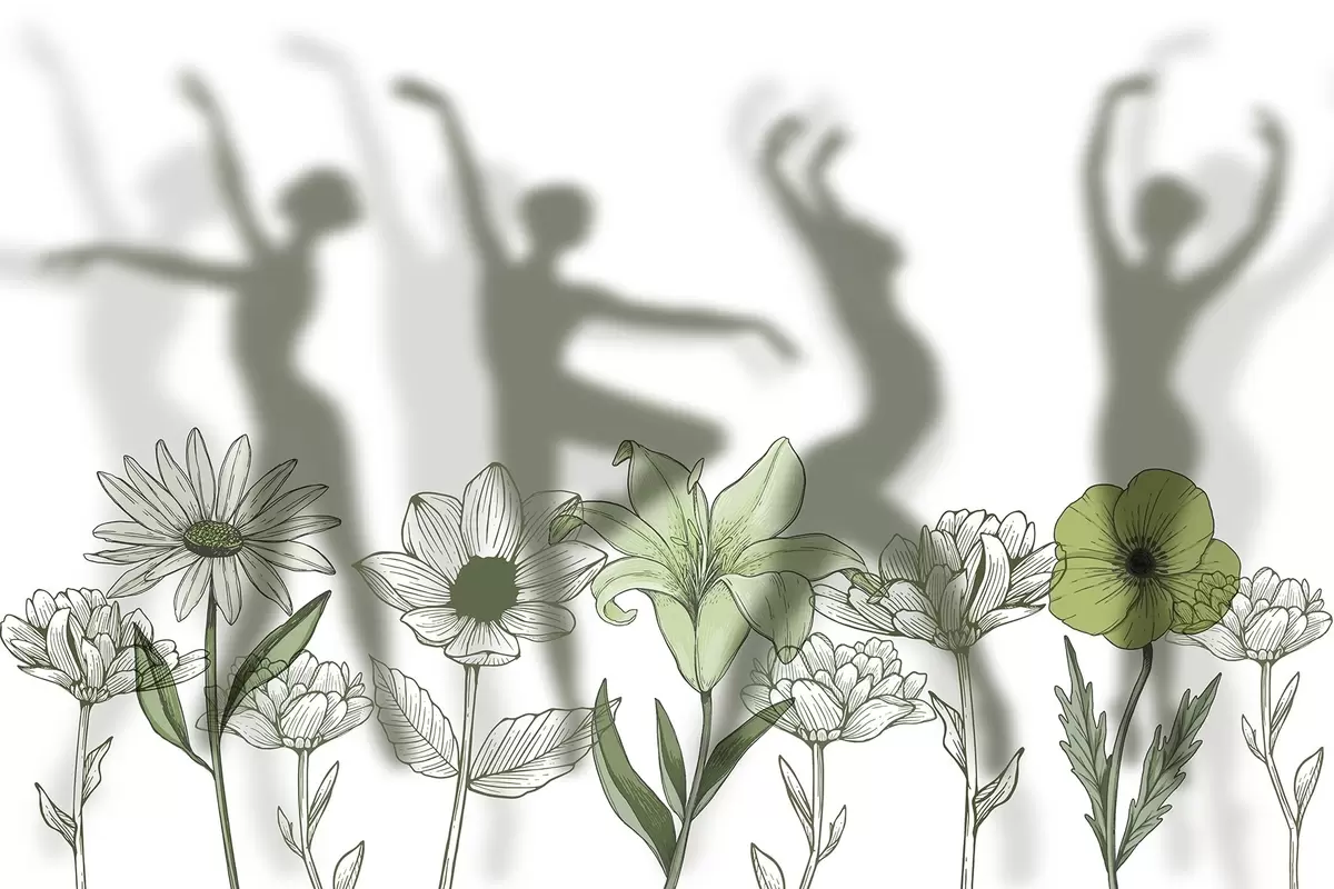Fototapeedid Balleriinide siluett, maalilised lilled, joontehnika, rohelised värvid Nr w04069v1