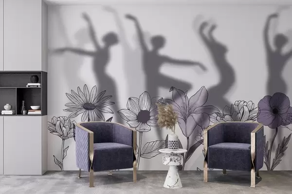 Fototapeedid Balleriinide siluett, maalilised lilled, joonekunst, hallid ja lillad värvid Nr w04069v2