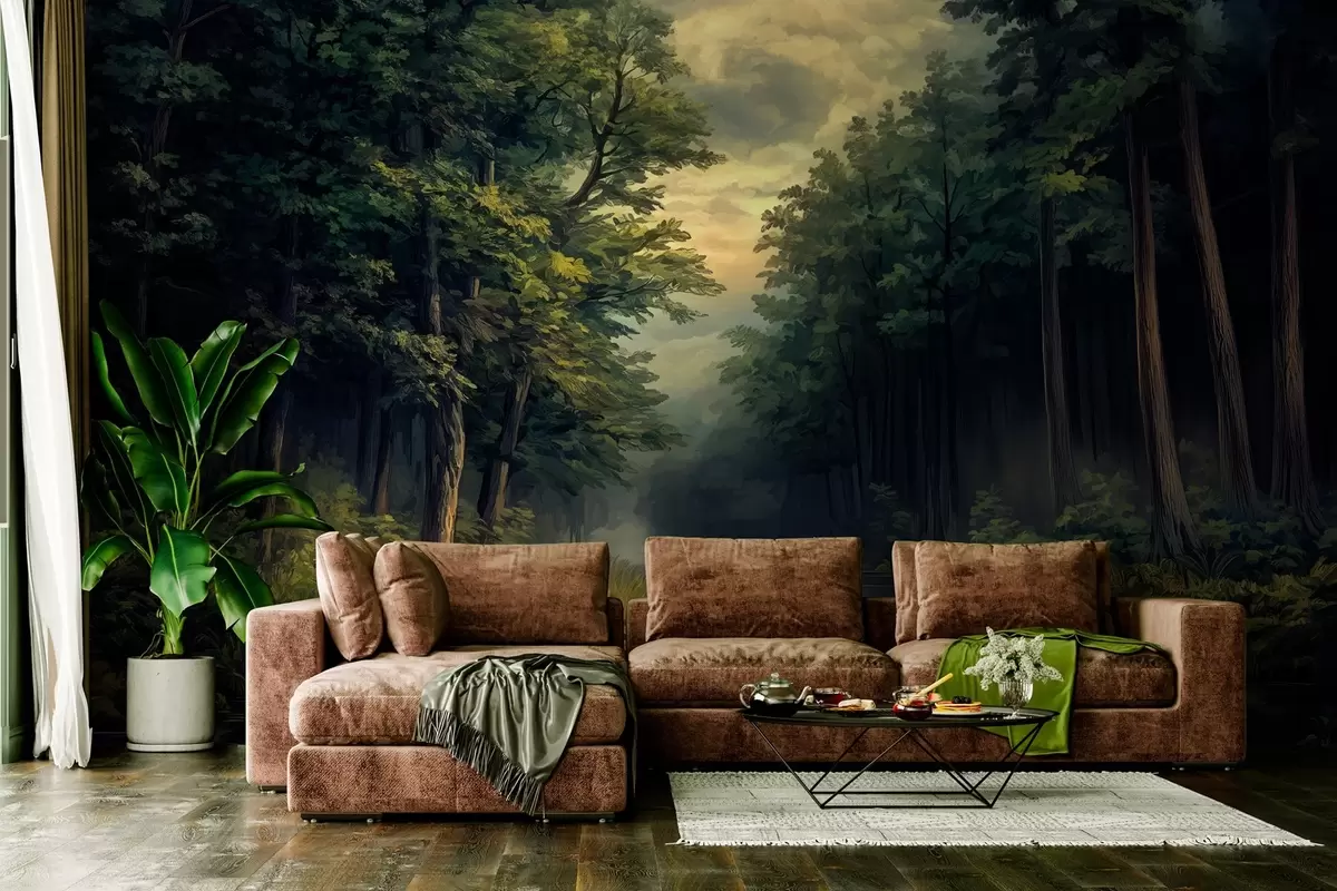 Fototapeedid Mets koos hirvede ja jõega hollandi õlimaalide stiilis Nr w04072