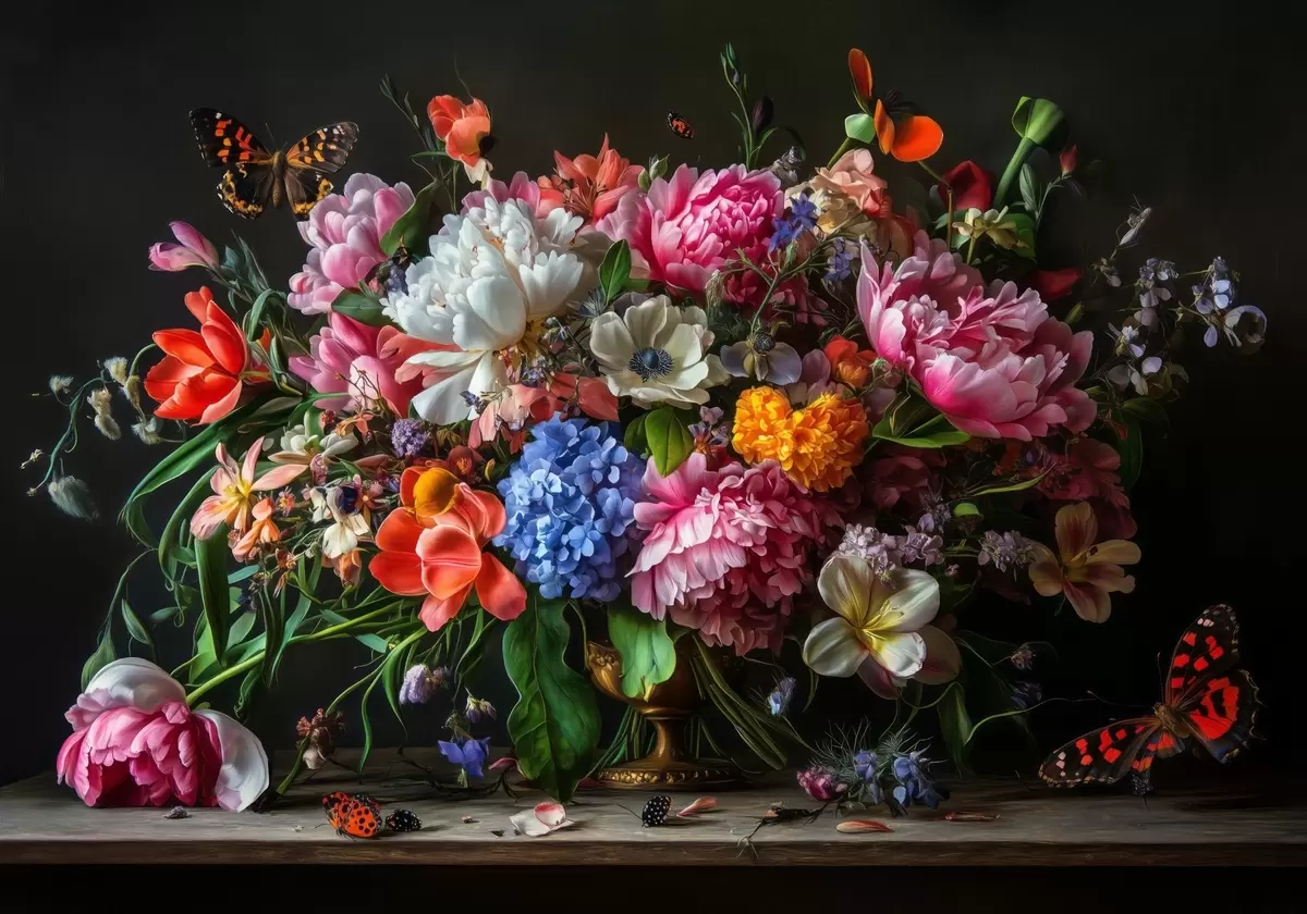 Fototapeedid xVII sajandi Hollandi õlimaalide stiilis luksusliku lillekompositsiooniga kimp. Nr w04078