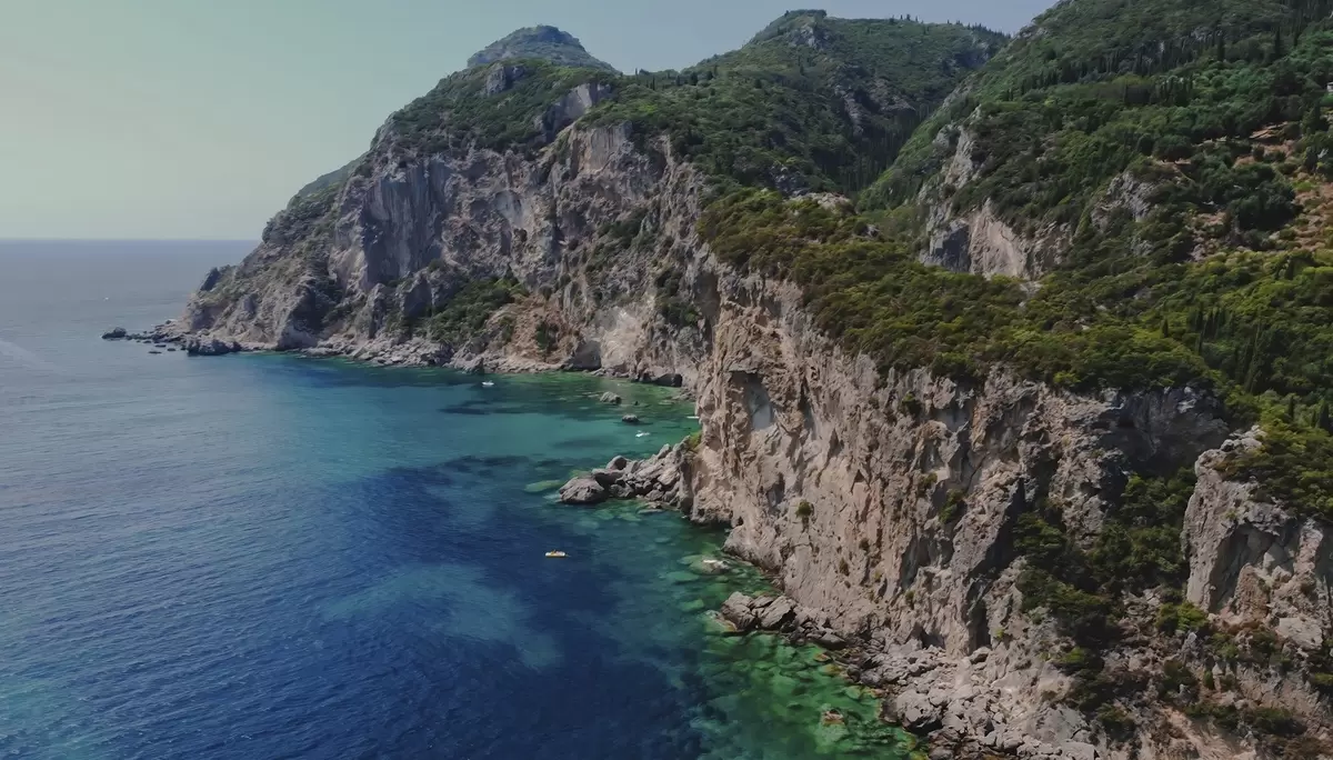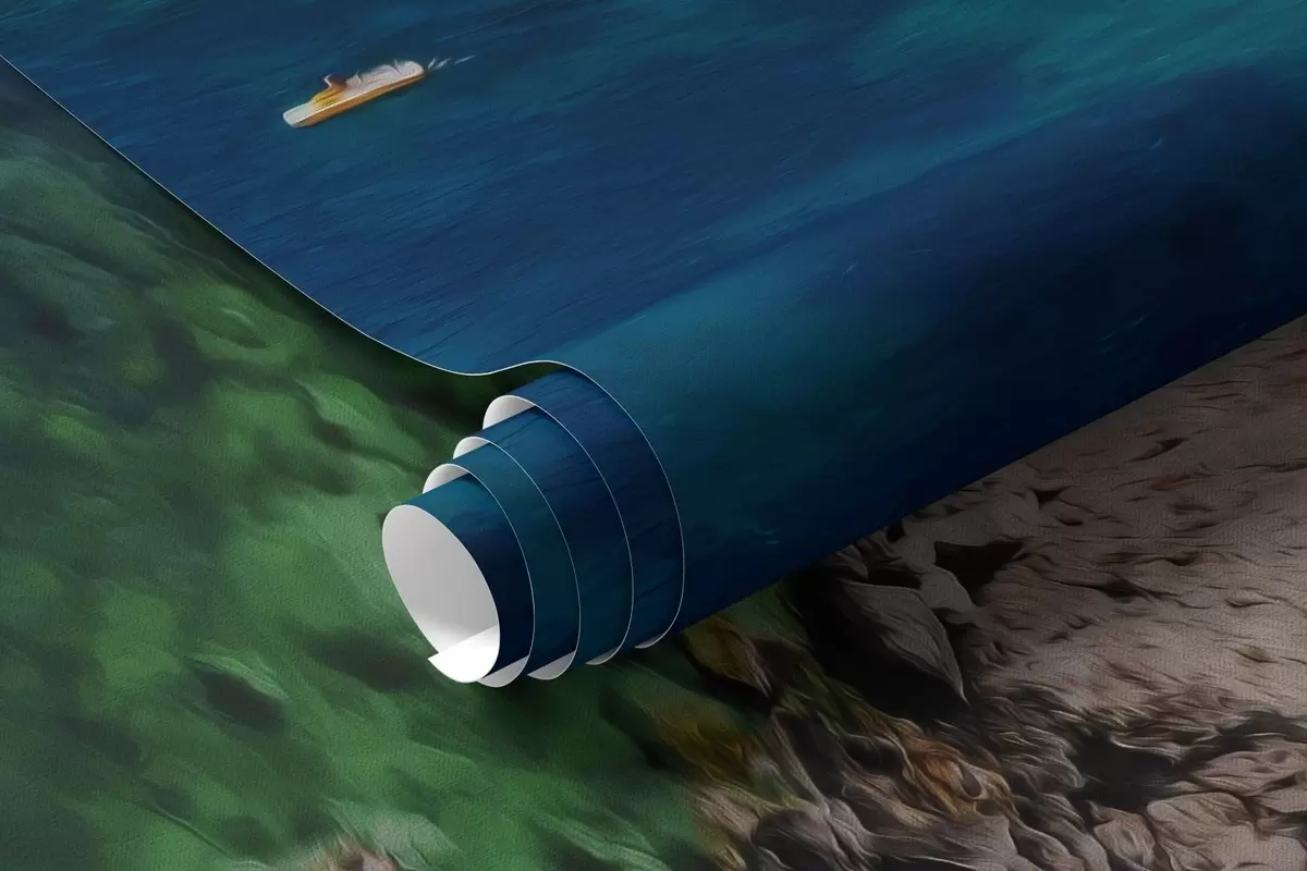 Fototapeedid Kaljumäed mere ääres, õlistiilis joonistus, akvamariinne vesi Nr w04096