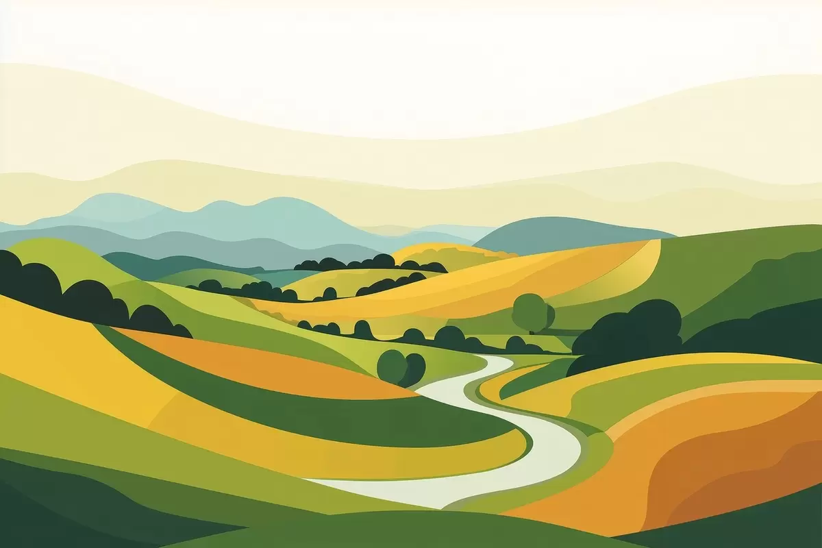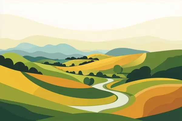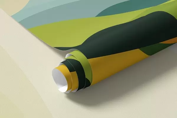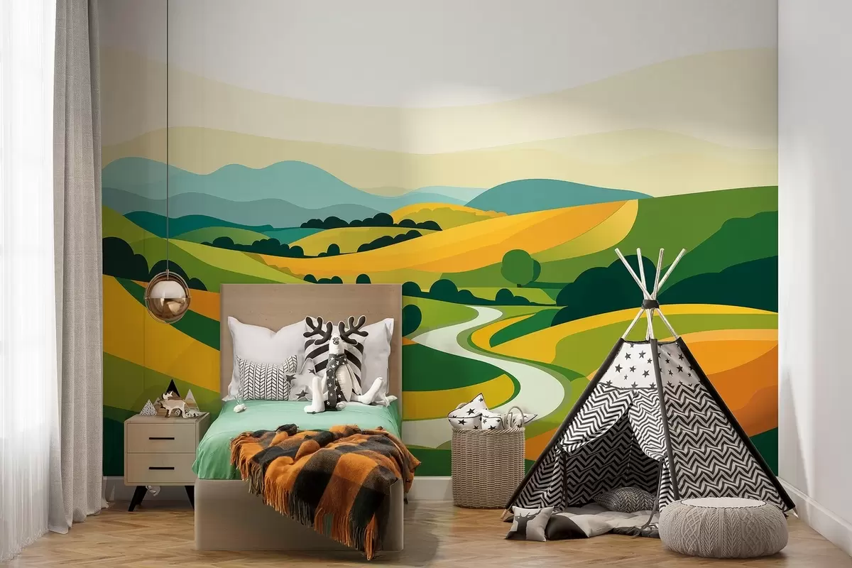 Fototapeedid Abstraktne maastik koos mägede ja puudega, erksad värvid Nr w04116