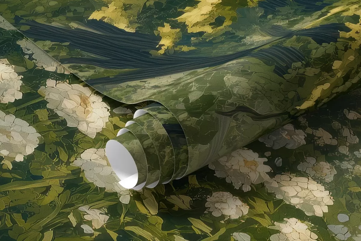 Fototapeedid Rada rohelises metsas, valged lilled, päikesevalgus, akrüülstiilis joonistus Nr w04119