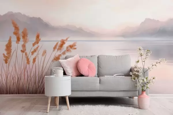 Fototapeedid maaliline järv koos pilliroo ja mägedega Nr w04315