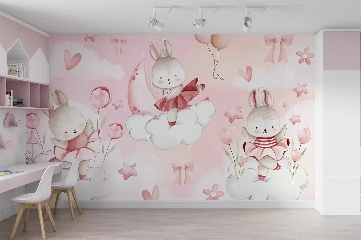 Fototapeedid Jänesed roosas balletikleitides pilvedel Nr w04333