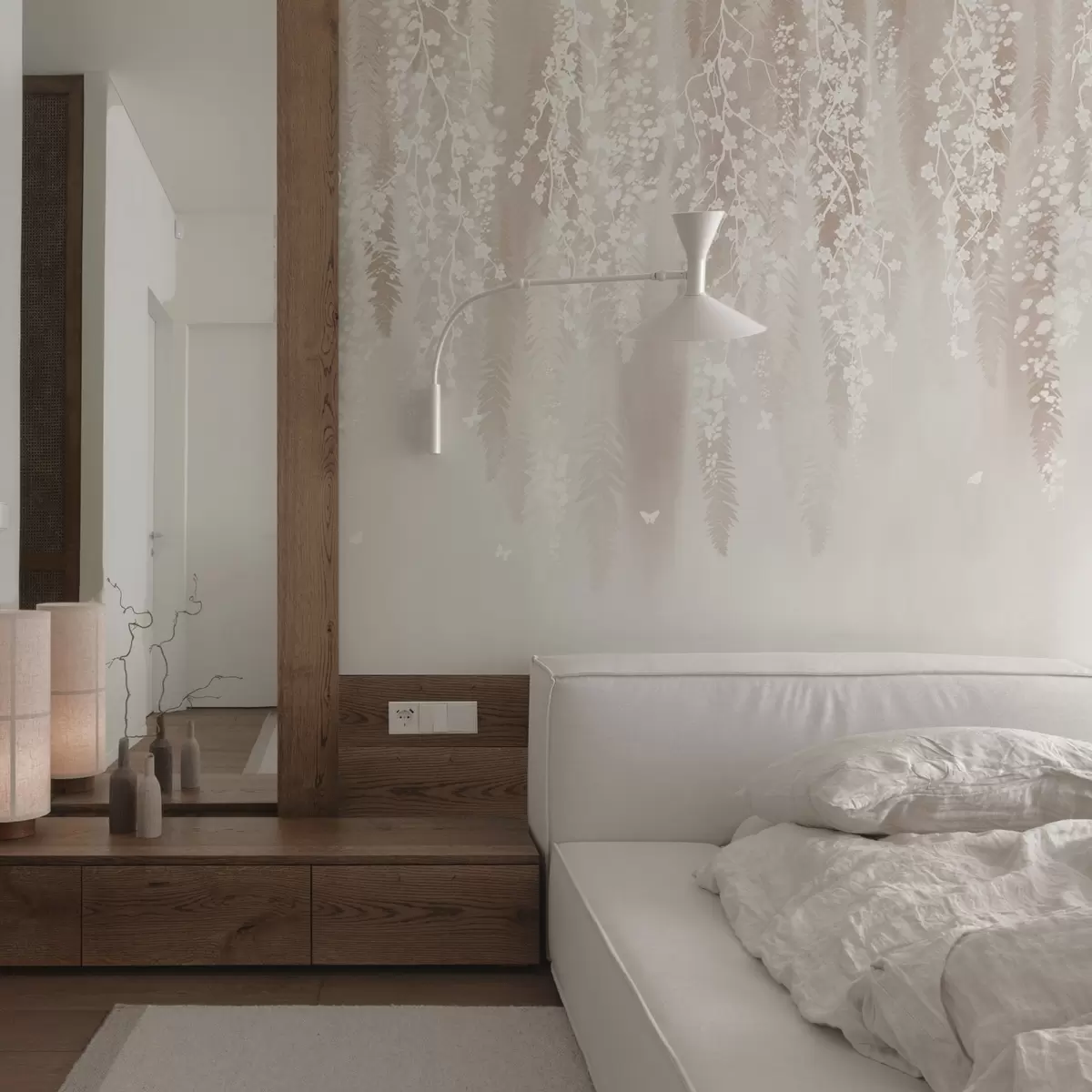 Fototapeedid Valgete lilledega heledad oksad õrnal taustal Nr w04417