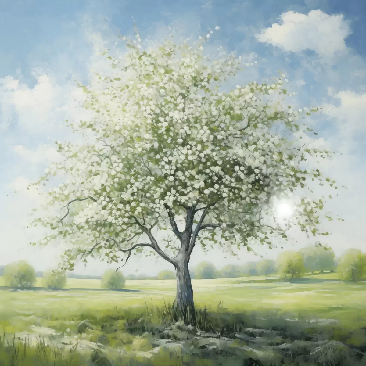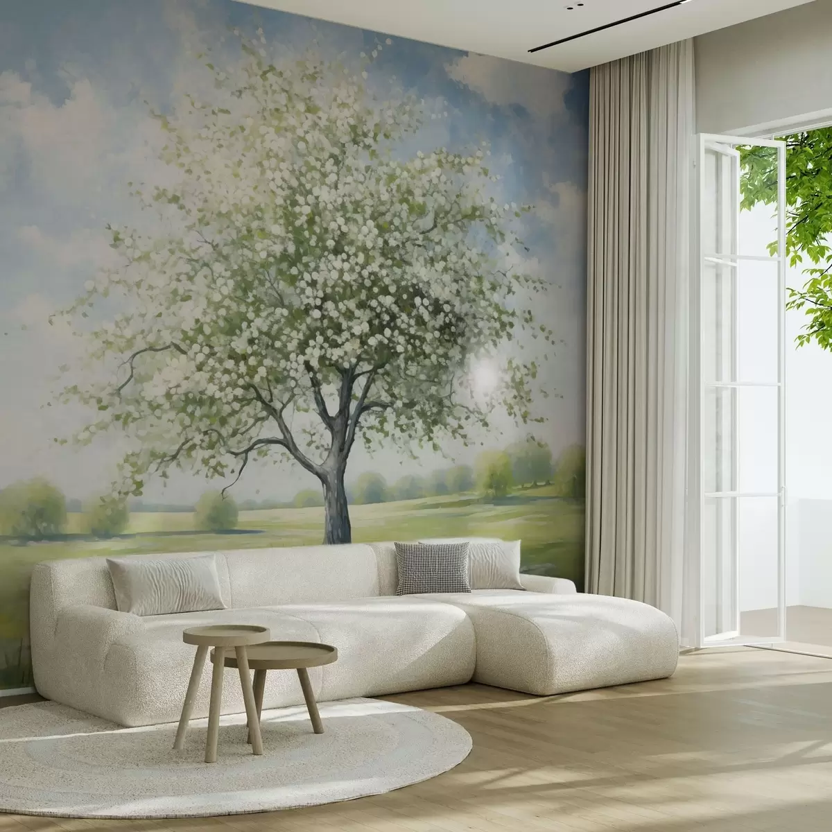 Fototapeedid Üksildane puu põllul, millel on valged lilled Nr w04445