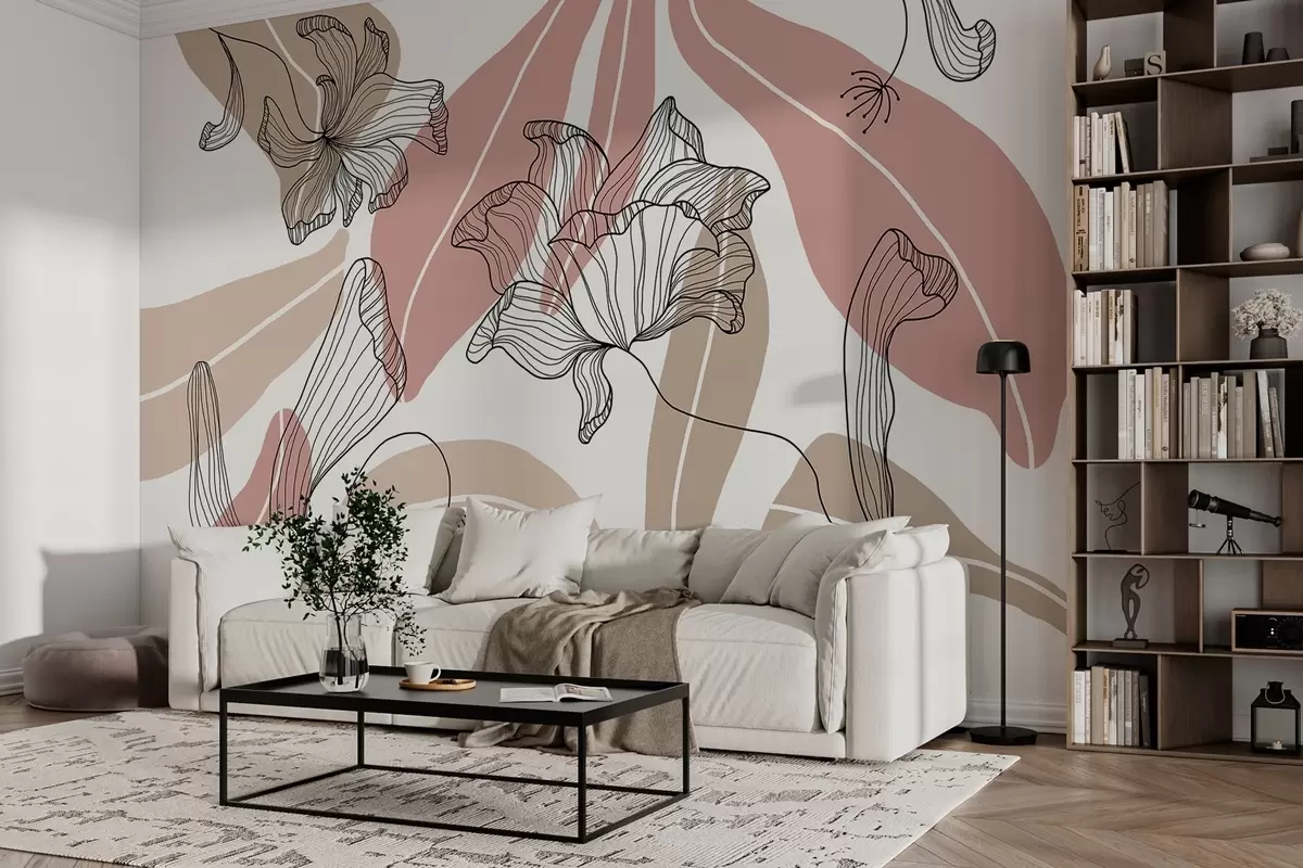 Fototapeedid abstraktsed lehed ja lilled puudritoose ja beežides toonides Nr w04499