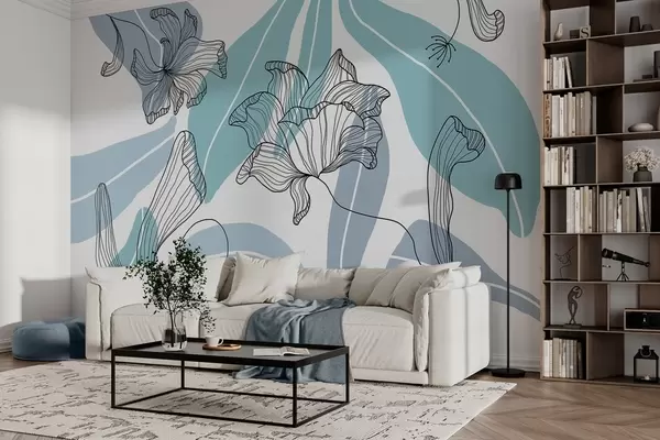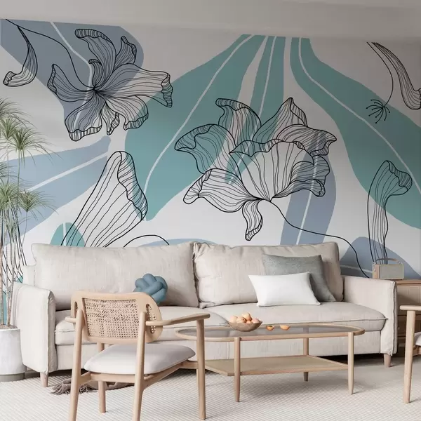 Fototapeedid sinistes toonides abstraktsed lehed ja lilled Nr w04499v2
