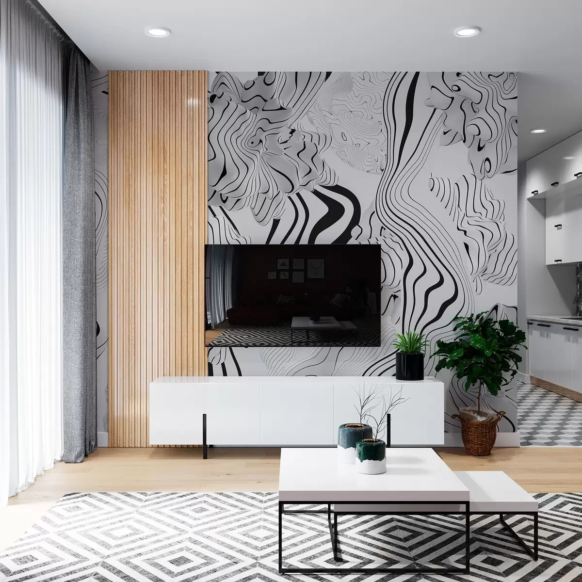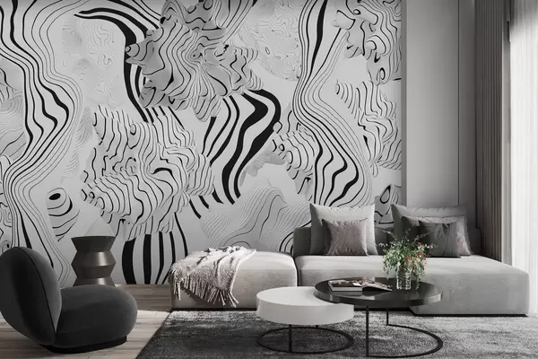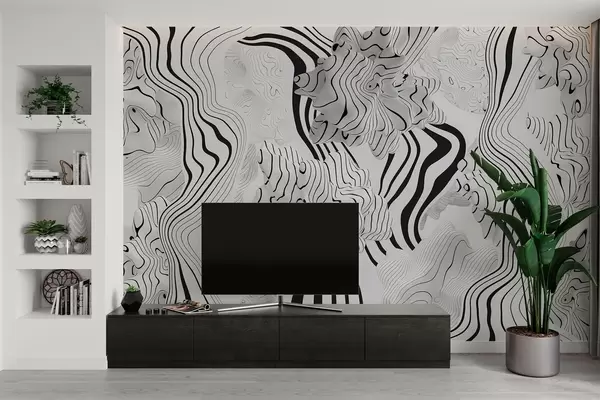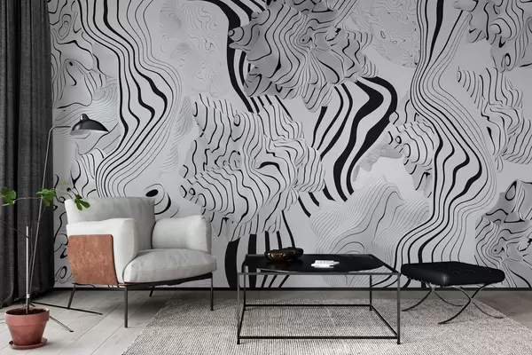 Fototapeedid abstraktsed orgaanilised kujundid 3D-stiilis valgetes ja hallides toonides mustade triipudega Nr w04627