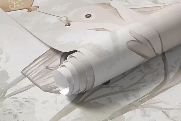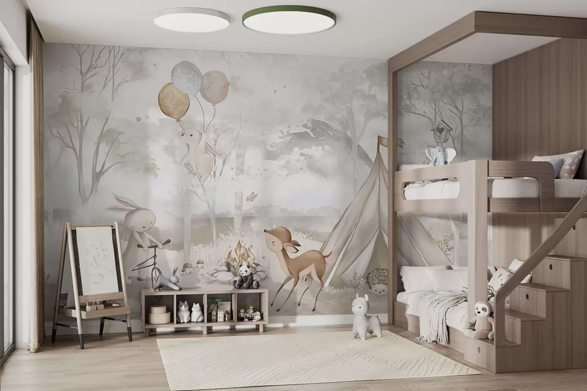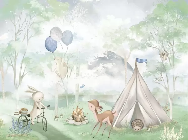 Fototapeedid Laste laagri soojad beežid toonid, telk ja metsa loomad Nr w04671