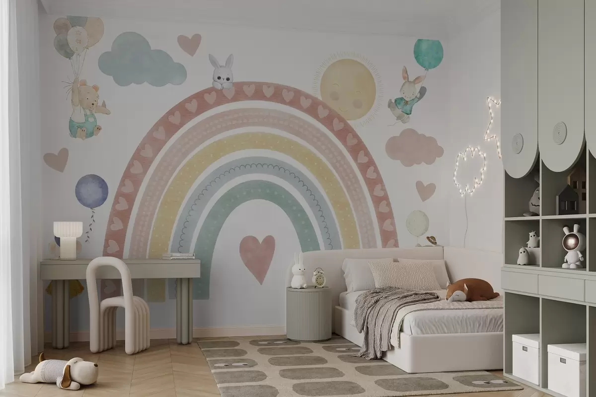 Fototapeedid Pastellne vikerkaar südamete, loomade ja õhupallidega Nr w04681