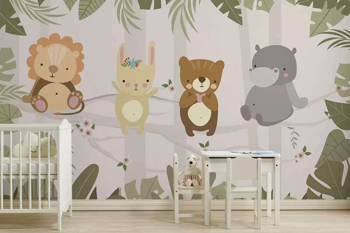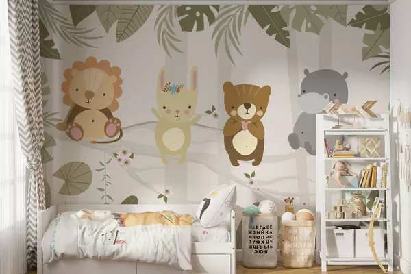 Fototapeedid Armas lõvi, jänes, karu ja jõehobu lehtede seas Nr w04682